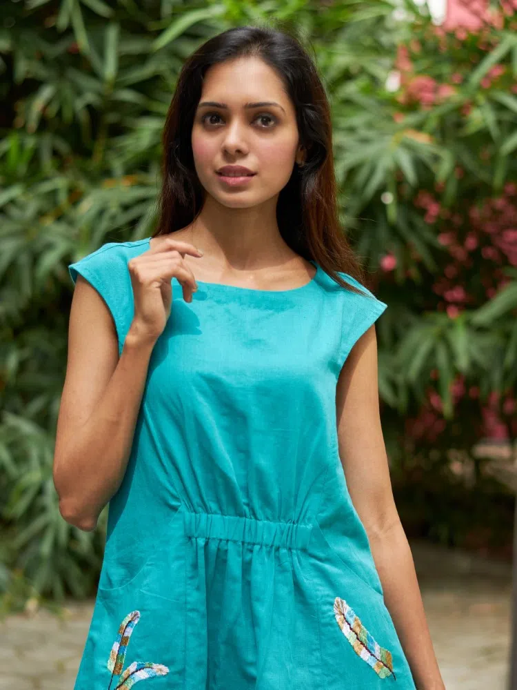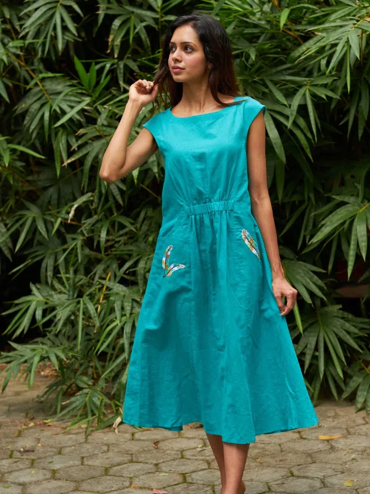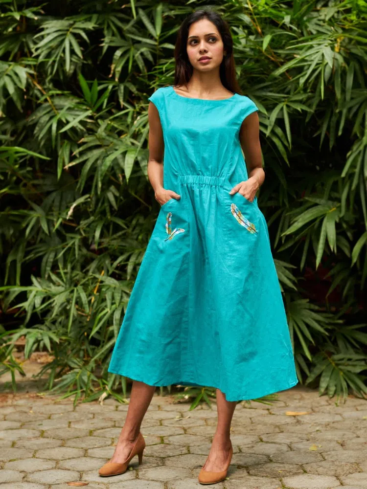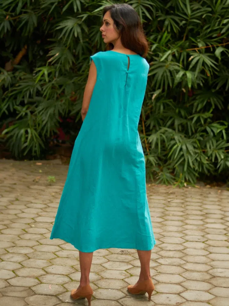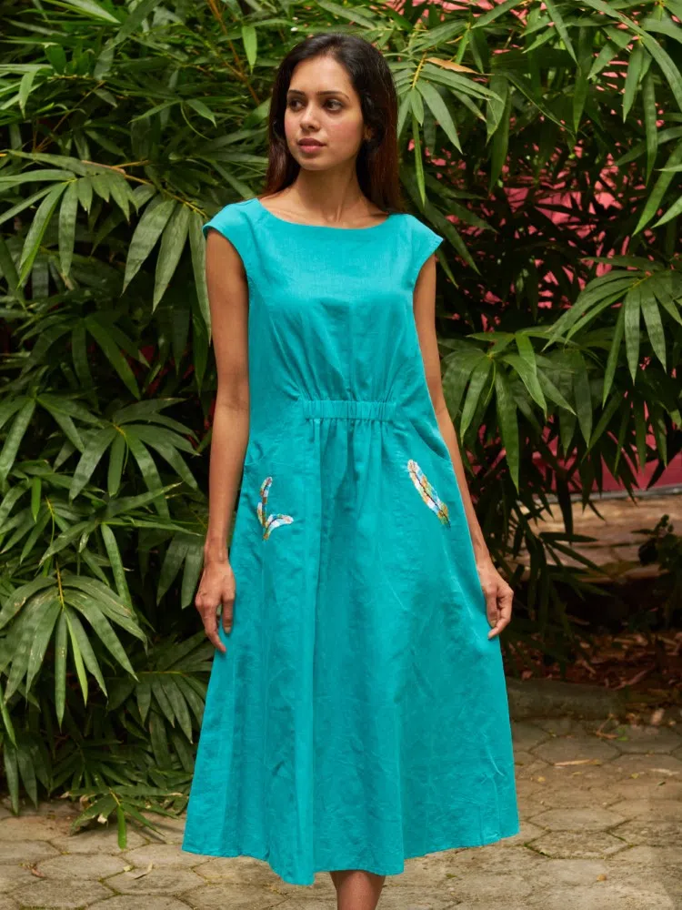 Dive into the essence of summer elegance with our AquaMeadow Embroidered Linen Dress, a breath of fresh air in your wardrobe. Crafted from the finest cotton linen blend, this dress combines comfort with a touch of artisan charm. The sea-green hue mirrors the tranquil ocean depths, while the hand-embroidered pocket details add a sprinkle of meadow-inspired whimsy. Perfect for those balmy days, the central elasticated waist cinches to create a silhouette that celebrates your natural shape. The sleeveless cut and mid-calf length make it an ideal choice for both casual outings and special occasions. Breeze through your day with this versatile piece that promises to keep you cool while looking effortlessly stylish. Whether paired with sandals for a beach getaway or dressed up with heels for an evening soiree, the AquaMeadow Dress is your go-to for a timeless, chic look.