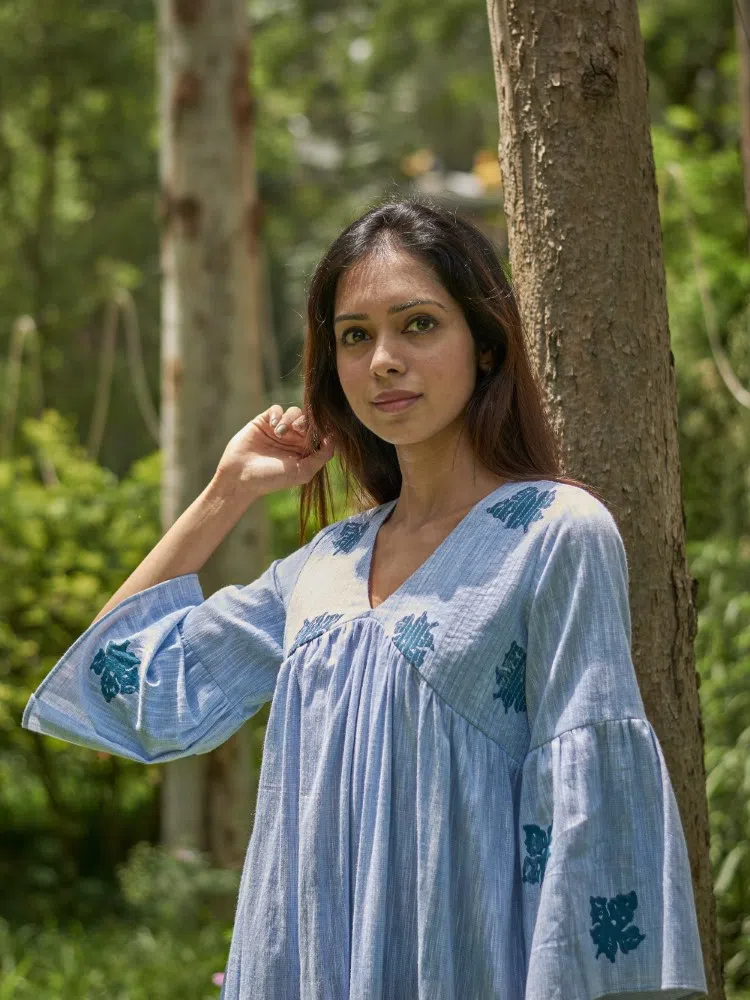 Step into the calming allure of our Azure Breeze Asymmetrical Dress, a piece that captures the essence of a serene sky. Crafted from the softest cotton slub, this dress is a symphony of comfort and airy elegance. The tranquil blue hue is reminiscent of a clear day, adorned with contrasting block prints that evoke a playful yet sophisticated charm. The machine running stitch along the yoke adds a touch of intricacy, leading to an asymmetrical gathered waist that creates a flattering, flowing profile. This dress is an ode to the relaxed spirit of summer days, perfect for picnics, beach outings, or simply enjoying the day. Accessorize with a pair of white sneakers or sandals for a casual look, or elevate it with heels for an evening out.