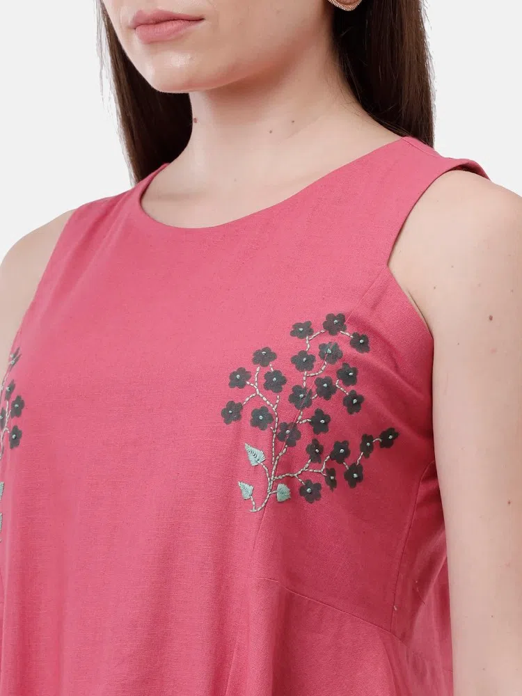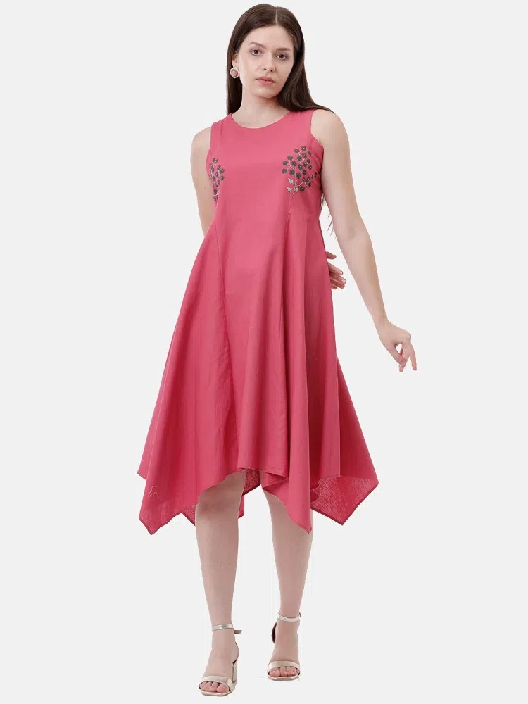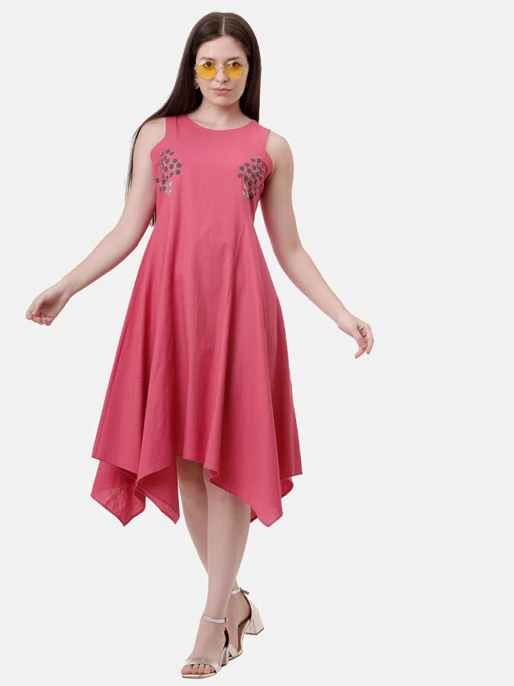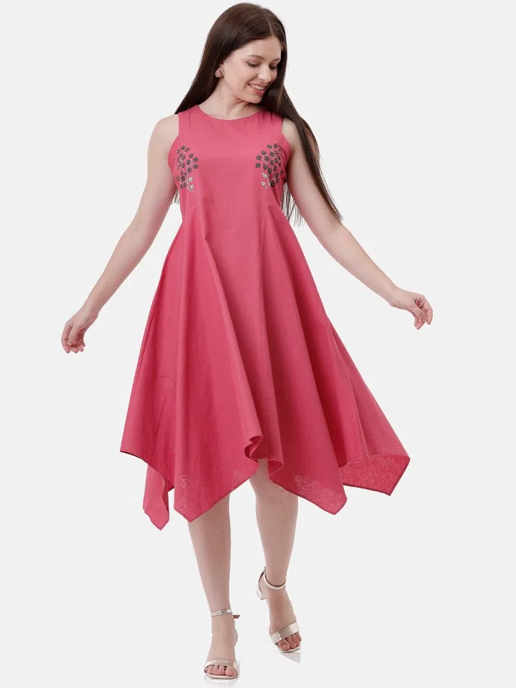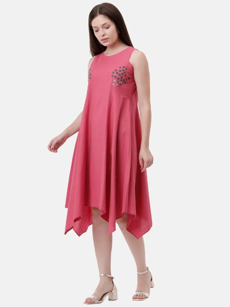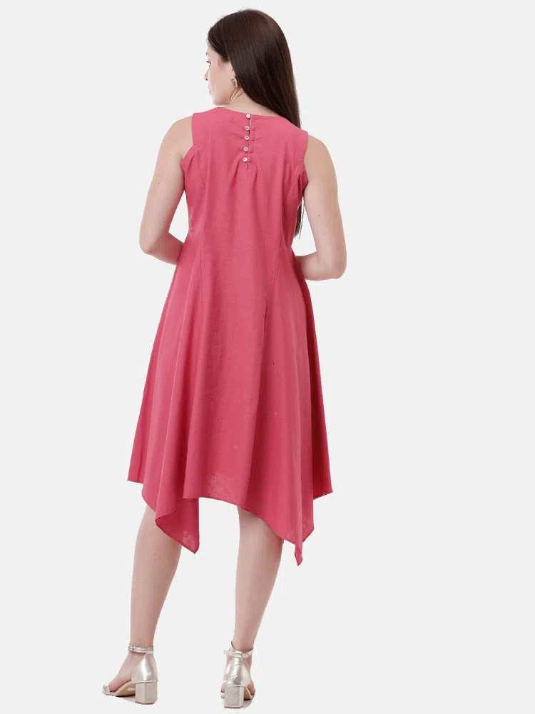 Step into the season with our Blossom Whisper Dress, designed to make a statement with its vibrant pink hue and unique design. Crafted from a blend of cotton and linen, this dress offers exceptional comfort and breathability, perfect for warm days. The block print introduces a traditional aesthetic, while the meticulous hand-embroidered accents add a layer of intricate detail, showcasing the artistry behind each piece. The asymmetrical hem adds a modern twist, creating a playful yet elegant look that sways gracefully with every move. Whether it’s a casual meet-up or a special event, this dress ensures you look stunningly chic.