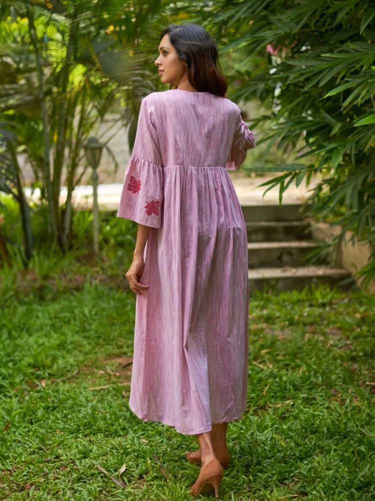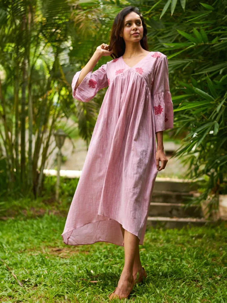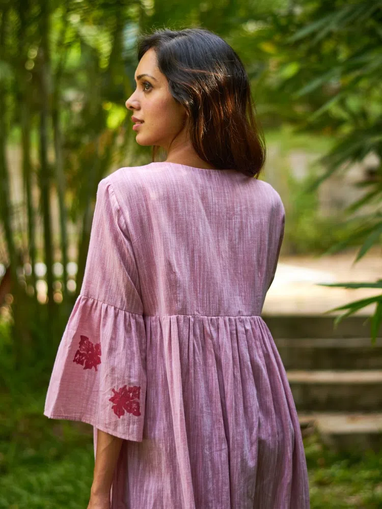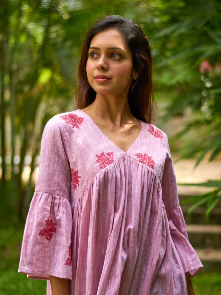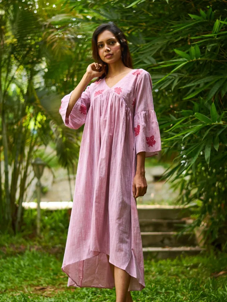 Introducing the Blossom Whisper High-Low Dress, where comfort meets whimsy in a dance of delicate design. This enchanting pink dress is made from the softest cotton slub, ensuring you feel as good as you look. The block print yoke adds a touch of traditional artistry, while the gathered waist cascades into a high-low hem that flirts with each step. This dress captures the carefree spirit of summer with its breathable fabric and loose, flowing silhouette.