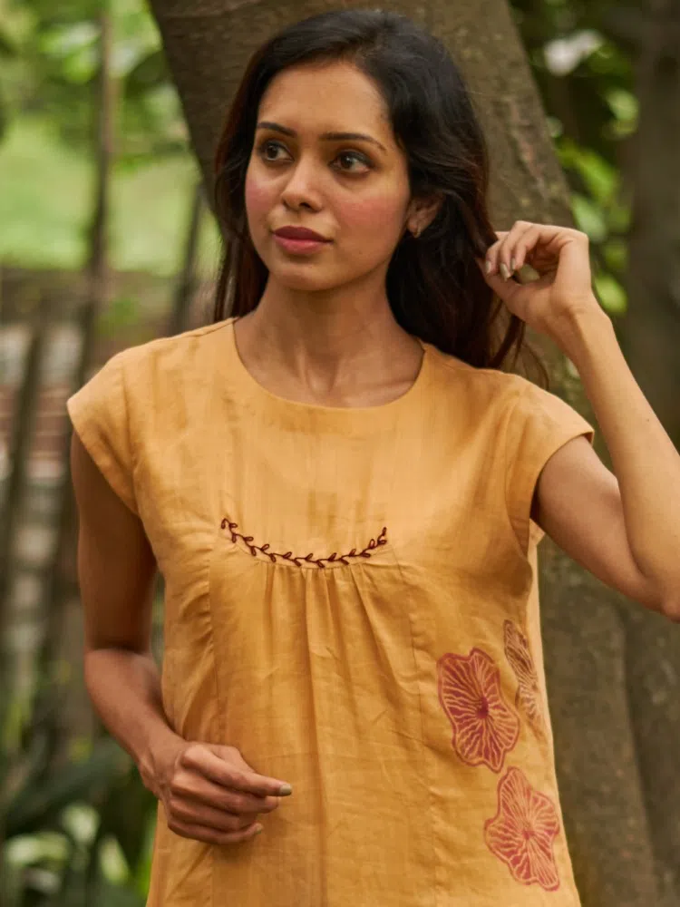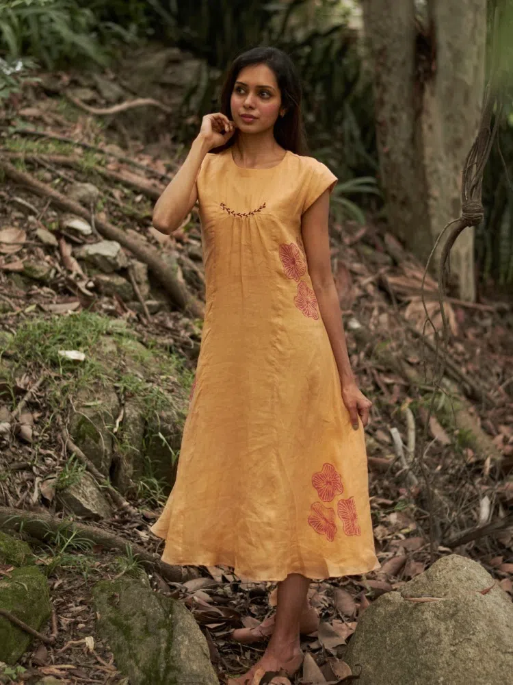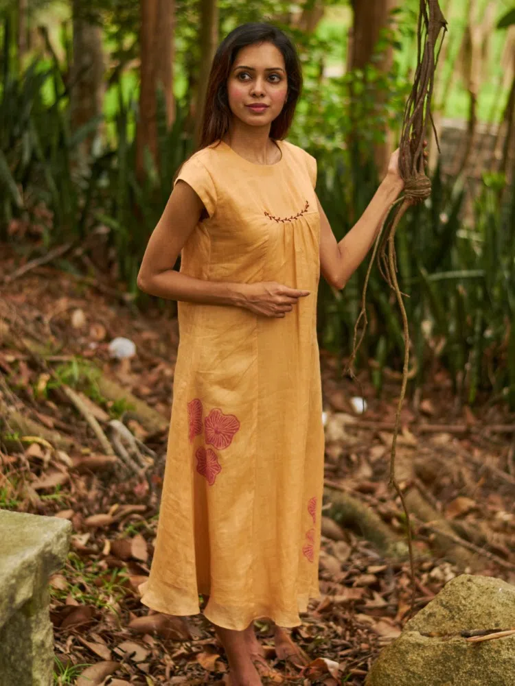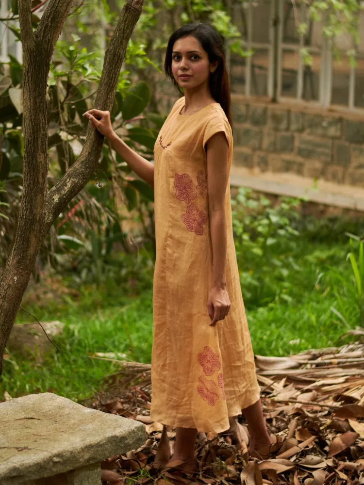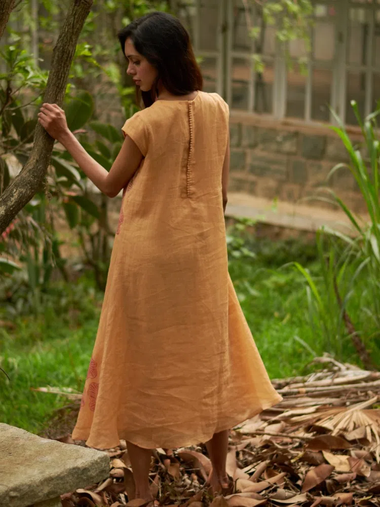 Introducing the Cantaloupe Bloom Gathered Dress, an embodiment of subtle elegance and a tribute to nature’s gentle hues. Fashioned from a sumptuous blend of linen and silk, this dress promises a luxurious feel against the skin, perfect for those seeking both comfort and sophistication. The cantaloupe color evokes the warmth of summer fruit, while the botanical block prints add a dash of floral charm. The center gather creates a flattering silhouette, drawing in the waist and flowing out into a long, airy skirt that moves with you. This piece is a serene addition to your collection, ideal for sunny days out or tranquil evenings in. Enhance its natural beauty with minimalist jewelry and earth-toned sandals for a refined, yet relaxed ensemble.