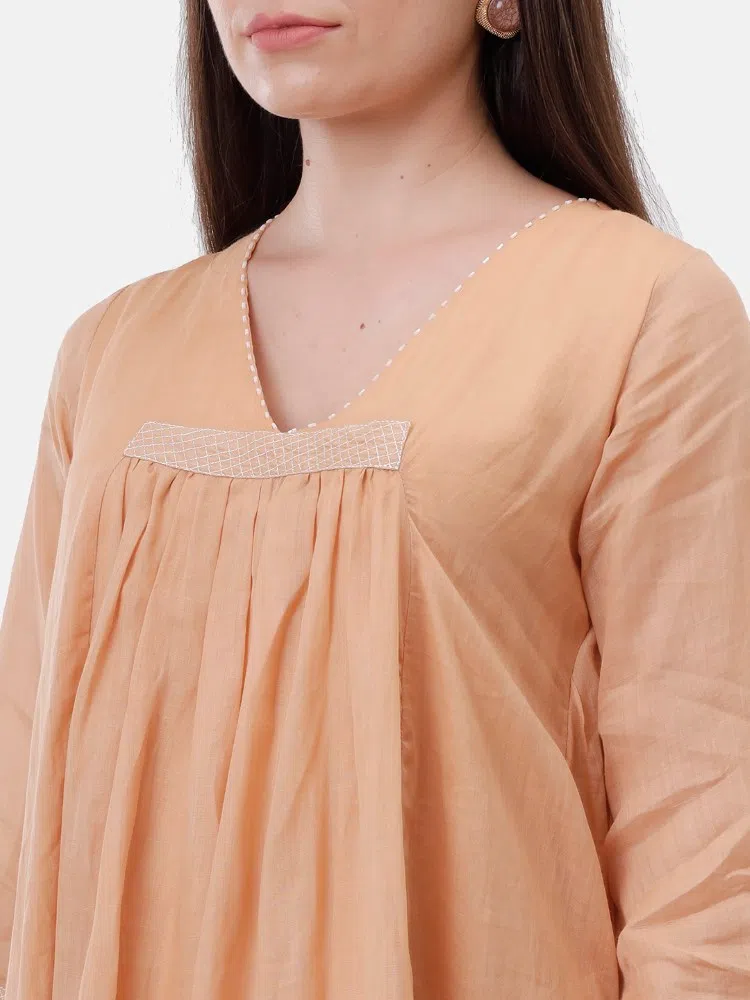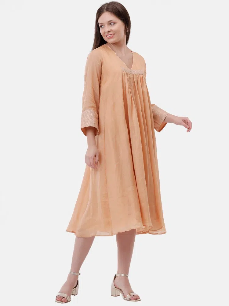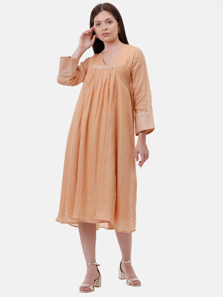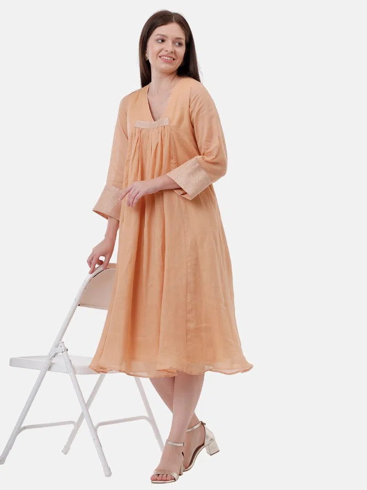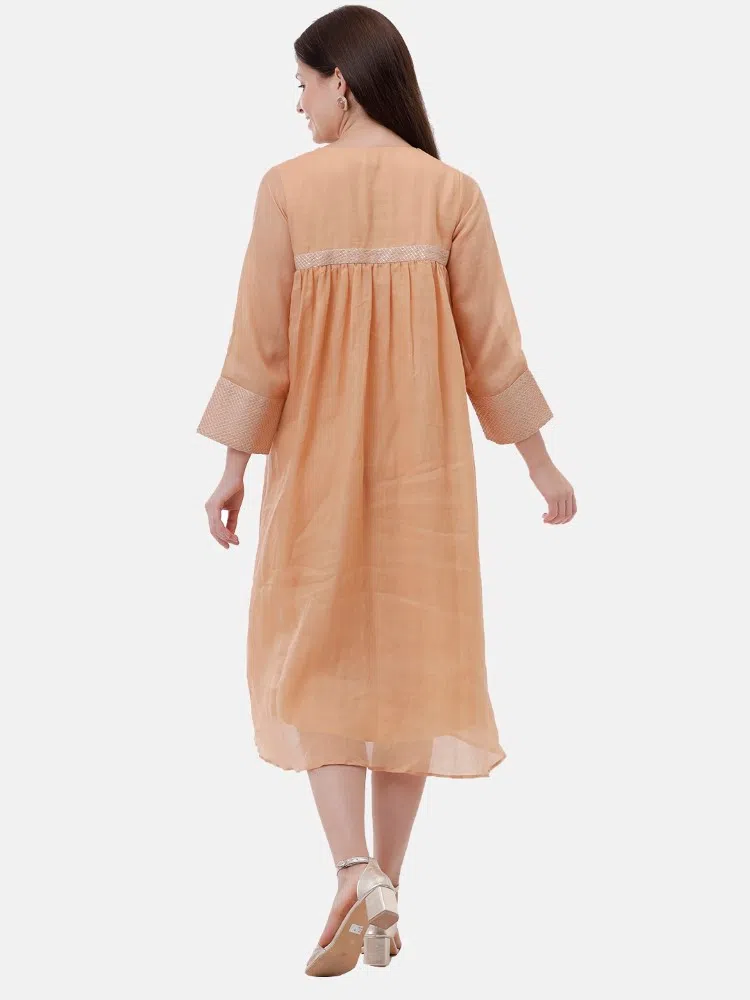 Experience the sheer elegance of our Cantaloupe Charm Dress, crafted from the finest linen silk blend that offers both luxury and comfort. This dress features a soft cantaloupe shade that radiates warmth and style, perfect for any season. A distinctive center gather adds a touch of sophistication, enhancing the fluid silhouette of the dress. The silver thread running stitch detailing subtly sparkles, catching the light with every movement. Ideal for both daytime elegance and evening grace, this dress is a stunning choice for those who value understated beauty and timeless design.