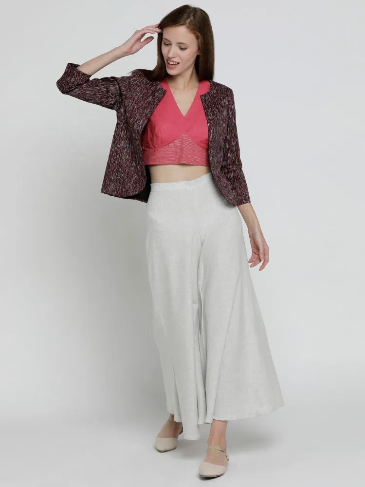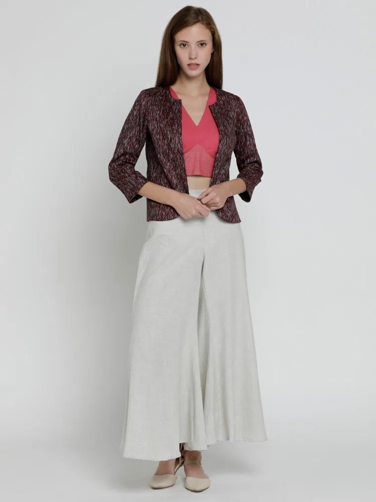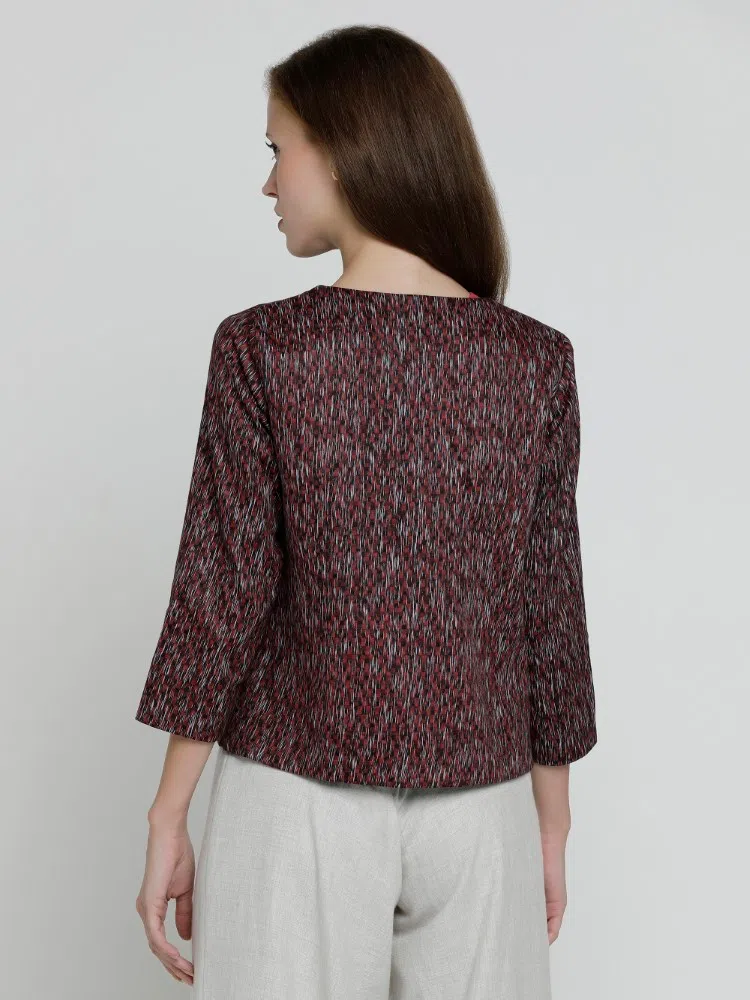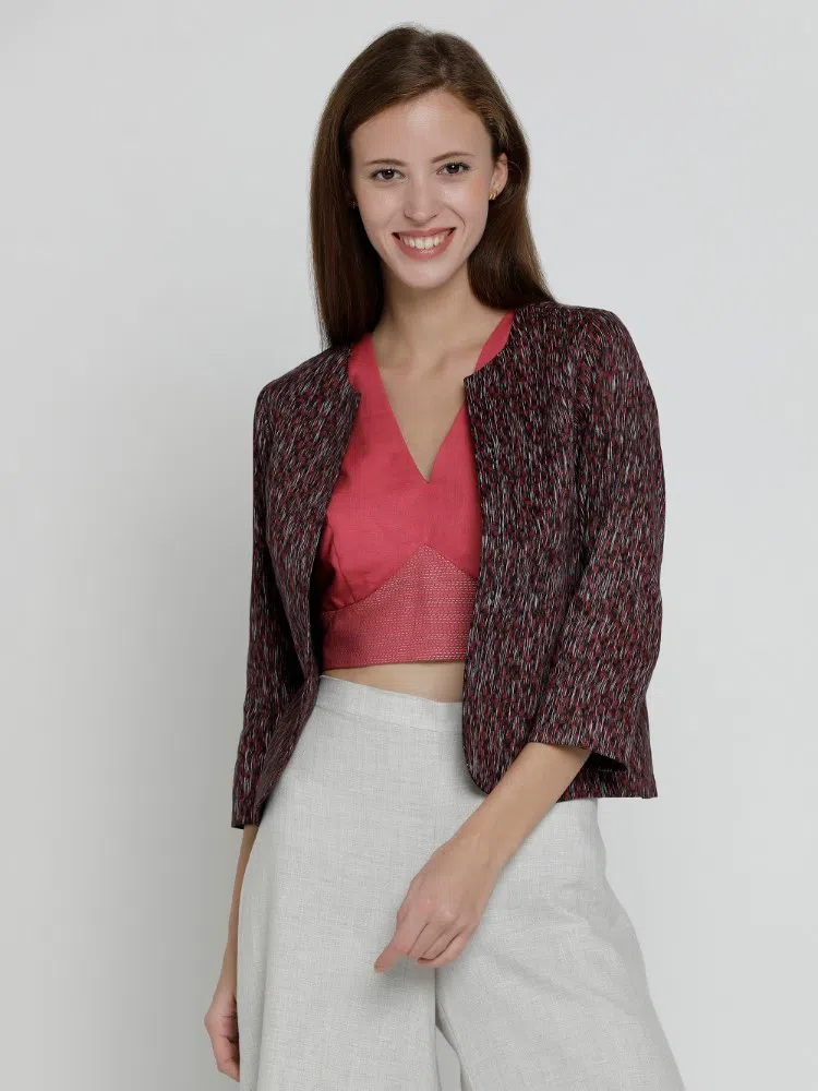 The “Crimson Weave Satin Cotton Jacket” is a stylish statement piece perfect for elevating your semi-formal attire. Crafted from luxurious satin cotton, this jacket offers a subtle sheen and a smooth texture that is both comfortable and chic. The rich red hue is infused with a pattern of darker tones, creating a dynamic and textured appearance that adds depth to the design. The jacket features a modern, open-front style with a relaxed fit, making it an ideal companion for both office wear and after-hours engagements. The three-quarter sleeves add a touch of contemporary elegance, making it versatile enough to pair with a sophisticated dress or to smarten up a casual top and trousers ensemble. This jacket is a perfect blend of functionality and fashion-forward styling.
