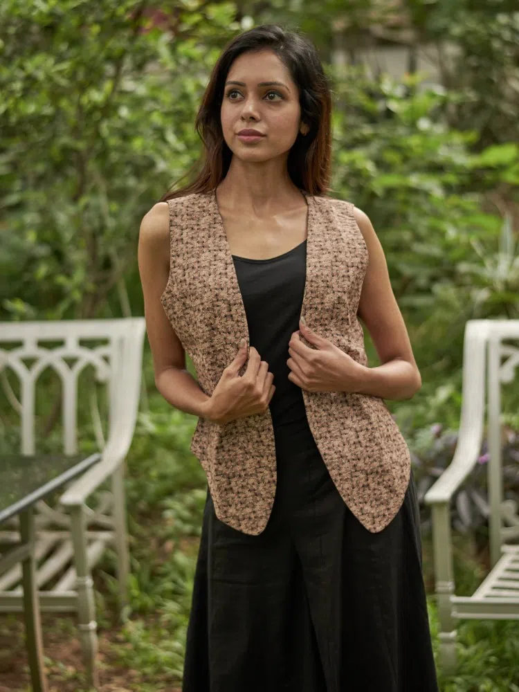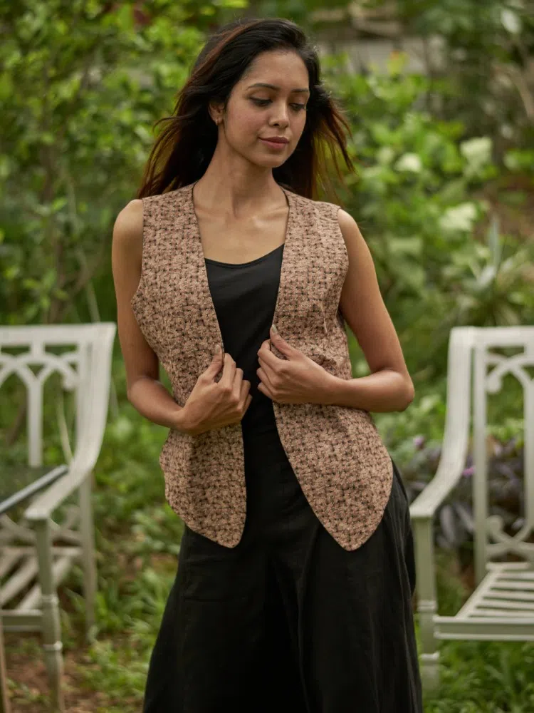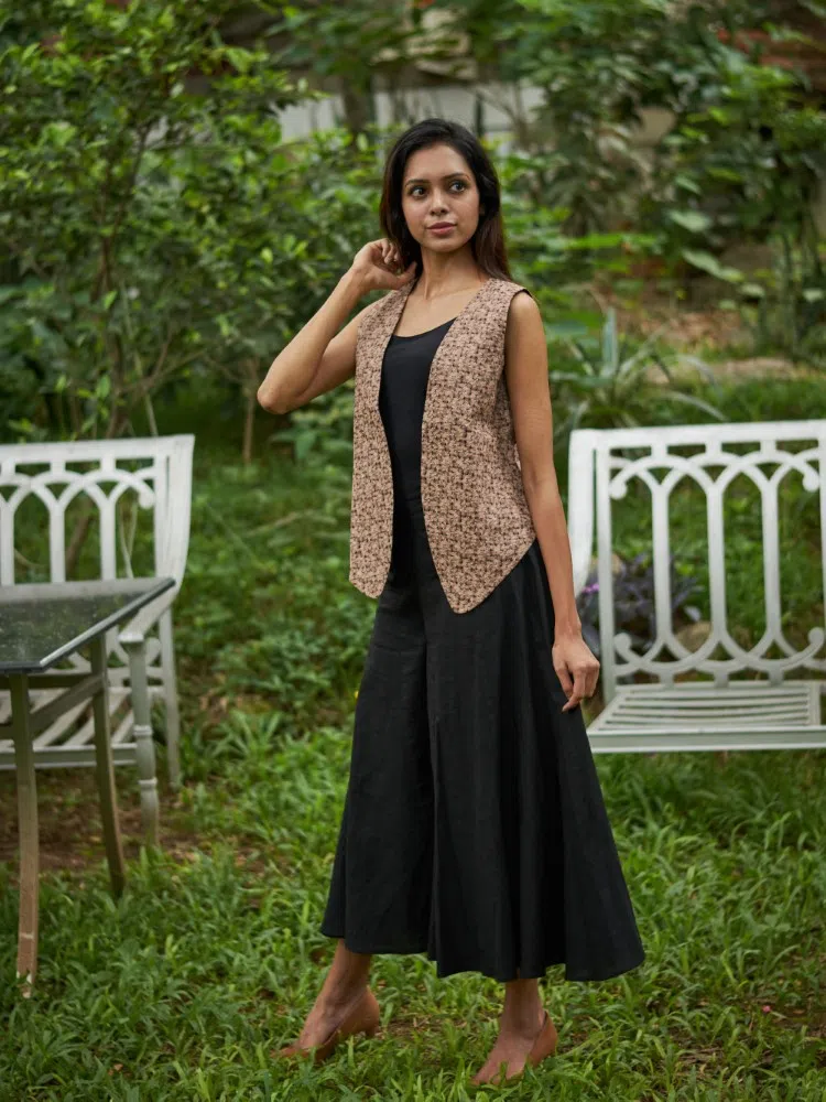 Embrace versatility and style with the Dual Charm Reversible Waistcoat. This unique piece is a sartorial staple, offering the option to switch between a richly textured fleshtone print made of fine cotton and a classic, refined black cotton silk side. The fleshtone side brings a warm, earthy tone to your ensemble, perfect for day wear or casual outings. Flip it to the black cotton silk side for an instantly elegant transformation, ideal for evening events or formal gatherings. The tailored cut ensures a flattering fit, while the premium materials promise comfort and durability. Whether you’re dressing up or down, this reversible waistcoat adds a touch of sophistication to any look.