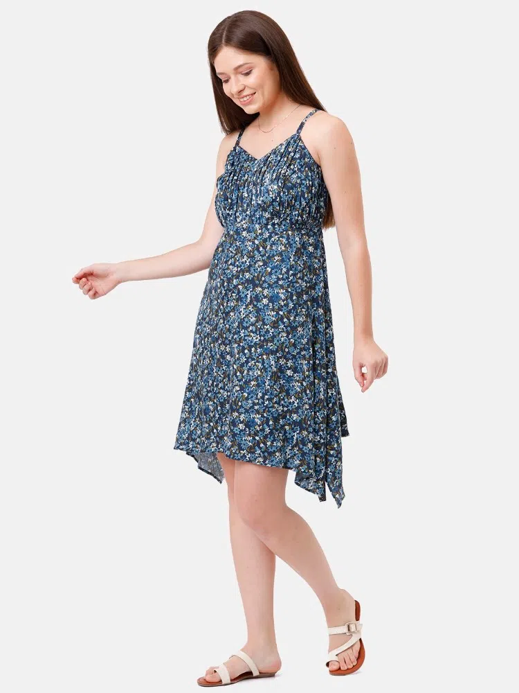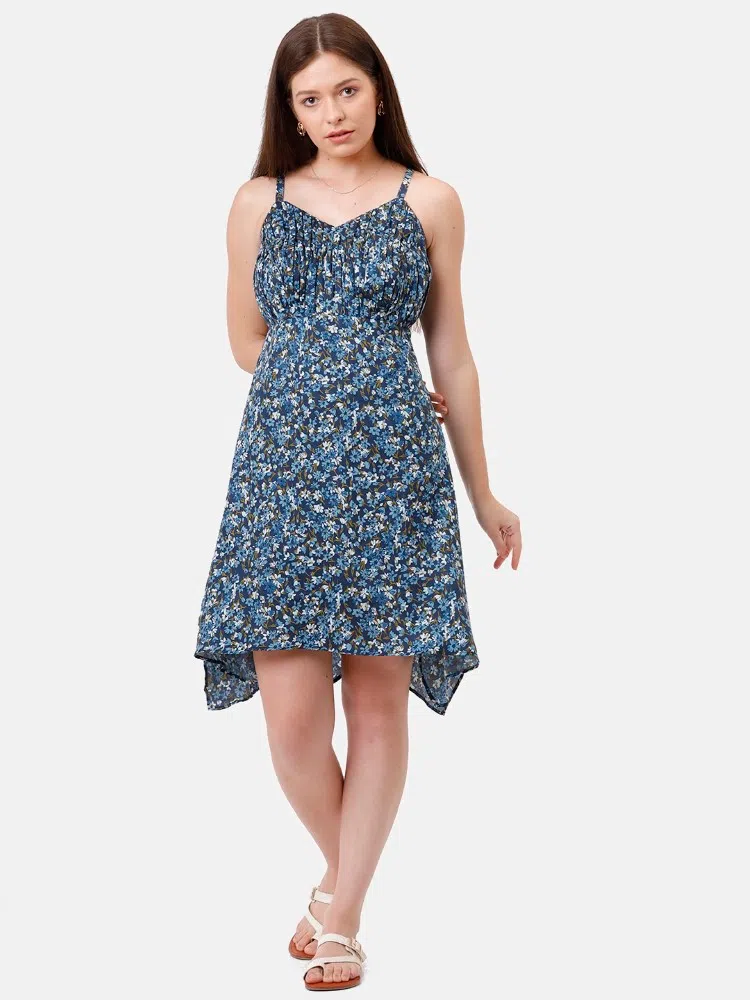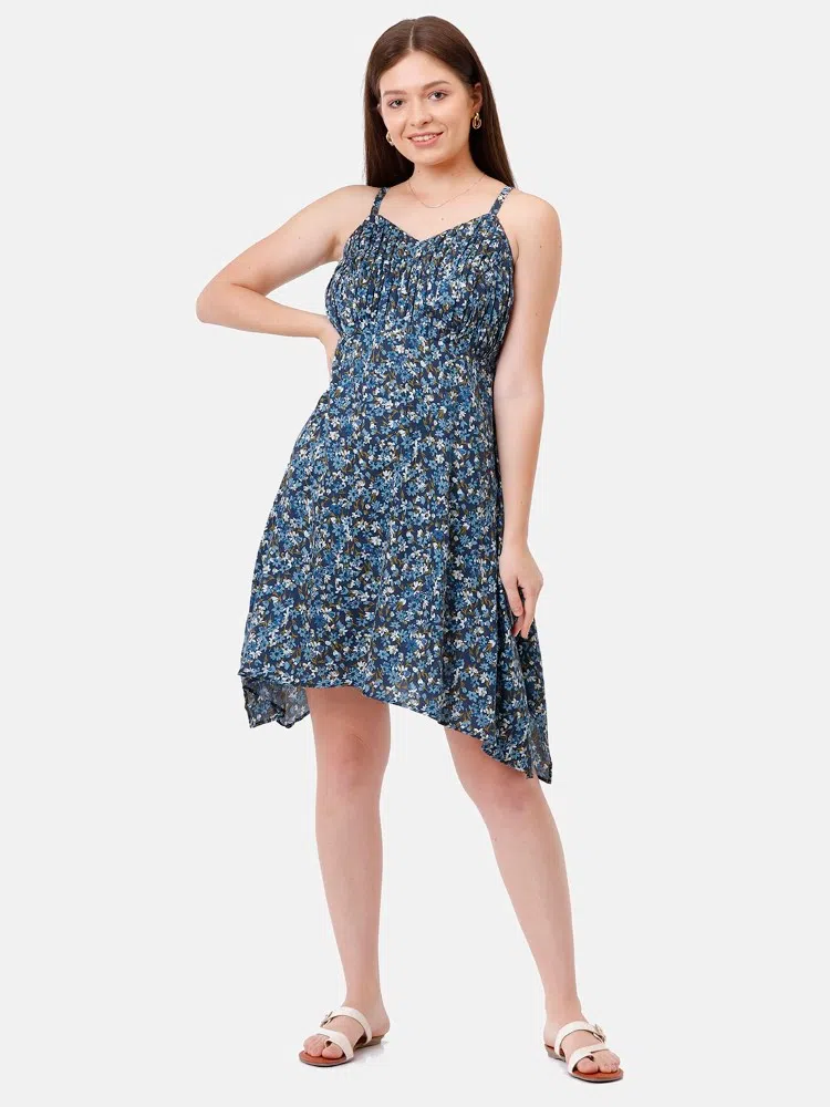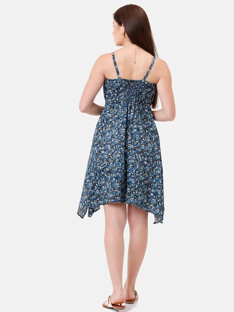 Embrace enchanting floral elegance with the Floral Finesse Dress, intricately designed from soft satin cotton with a charming navy blue floral print. This dress is crafted with a flattering gathered yoke that flows into an asymmetrical hem, effortlessly enhancing your movements with a graceful flutter. The slender spaghetti straps add a delicate, feminine touch, making it an exquisite choice for evening events or sophisticated daytime outings. Versatile and vibrant, this dress is a celebration of floral beauty and stylish comfort, suitable for any occasion.