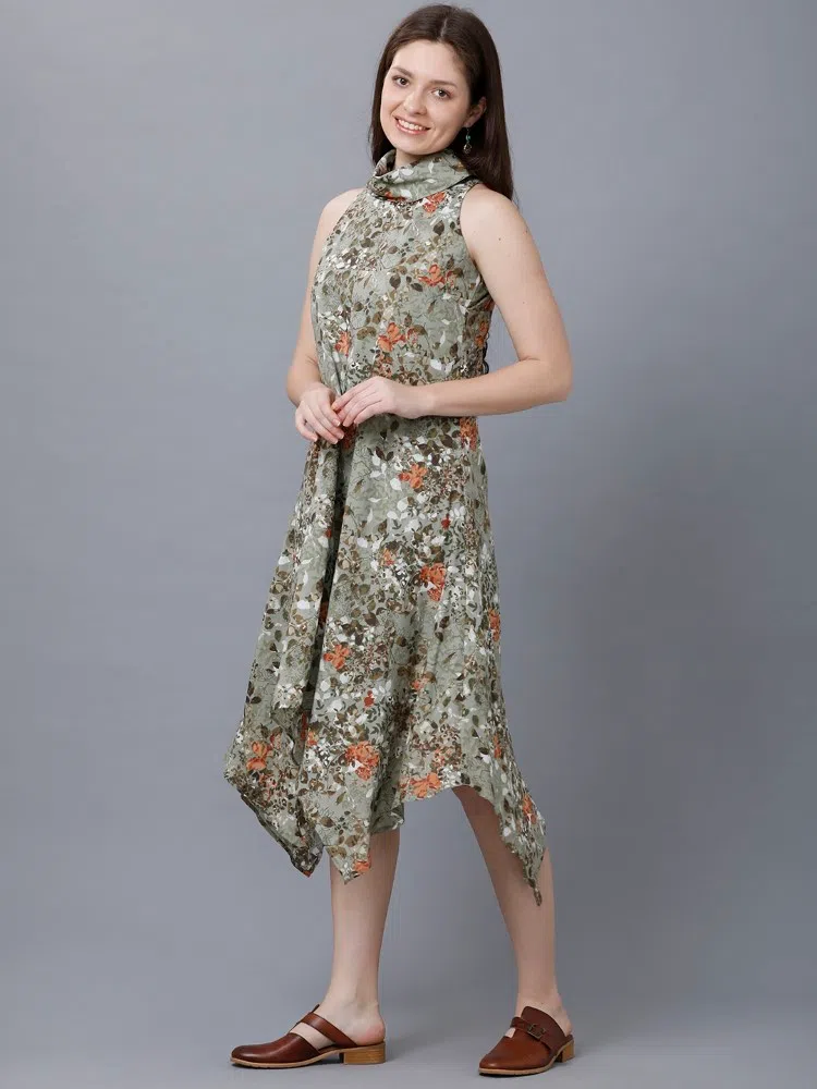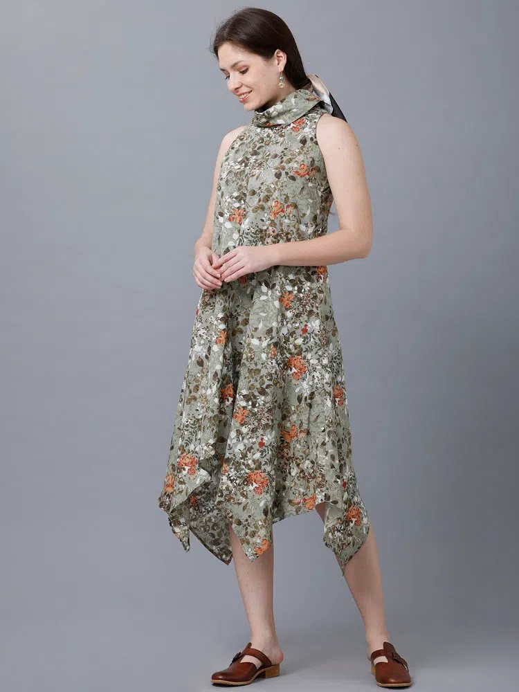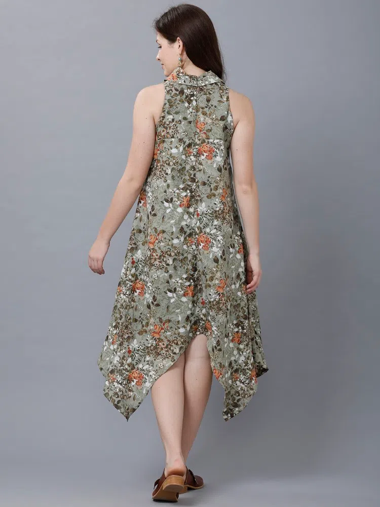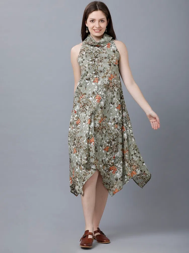 The Forest Foliage Asymmetrical Dress is an exquisite blend of elegance and natural beauty, perfect for those who seek to make a graceful statement. This dress is crafted from cambric cotton, known for its lightness and fine texture, ensuring a comfortable fit through all seasons. The asparagus green floral pattern over a subtle green background captures the essence of a forest in full bloom, offering a print that’s both sophisticated and soothing. The standout feature, a zipper cowl neck, provides a modern twist to the classic cowl design, adding versatility and a contemporary edge. The asymmetrical hemline enhances the flowy silhouette, making it ideal for both casual outings and more formal events. This dress is a wonderful choice for anyone looking to combine the beauty of floral prints with the chic style of asymmetrical cuts.