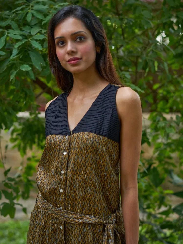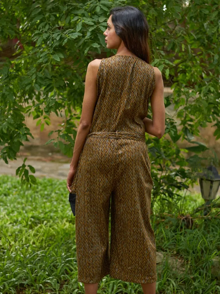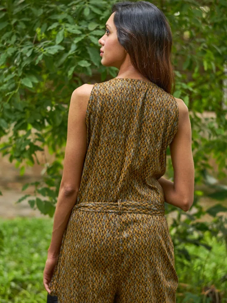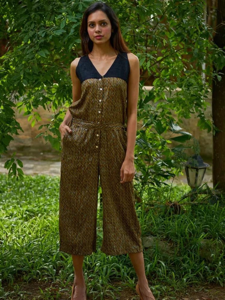 Introducing the Golden Meadow Jumpsuit, a perfect blend of style and comfort designed for the modern woman. This stunning jumpsuit showcases a vibrant yellow hue that captures the essence of sunny days and lively spirits. The 3/4th length offers a chic and contemporary look, making it ideal for various occasions, from casual brunches to evening gatherings. The pintuck detailing on the yoke adds a sophisticated touch, highlighting the attention to detail and craftsmanship involved in creating this piece. Made from premium fine cotton, this jumpsuit ensures a soft and breathable experience, keeping you comfortable throughout the day.