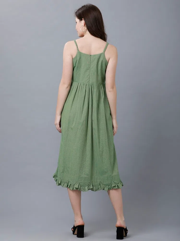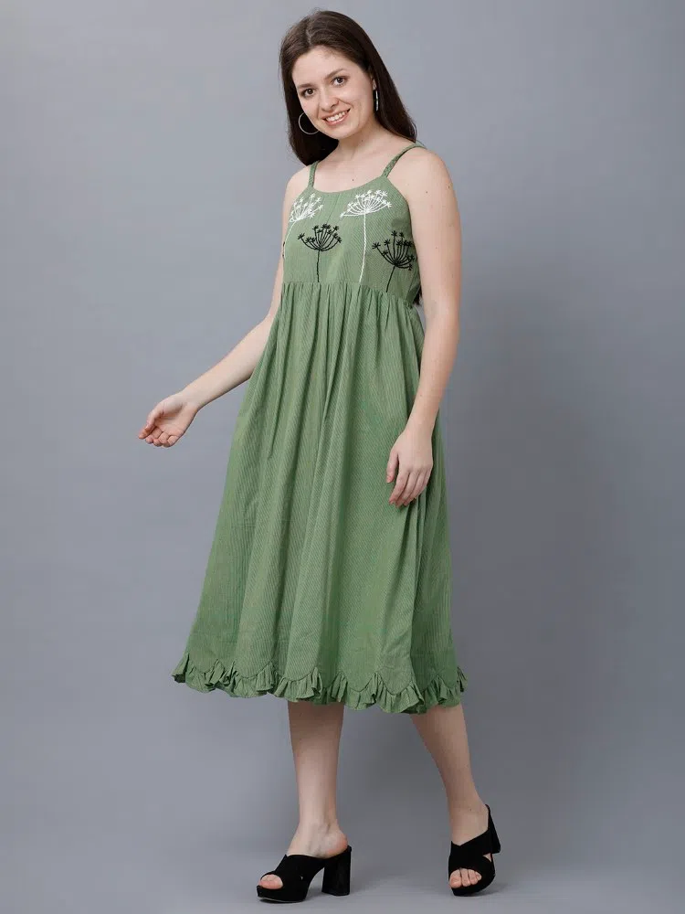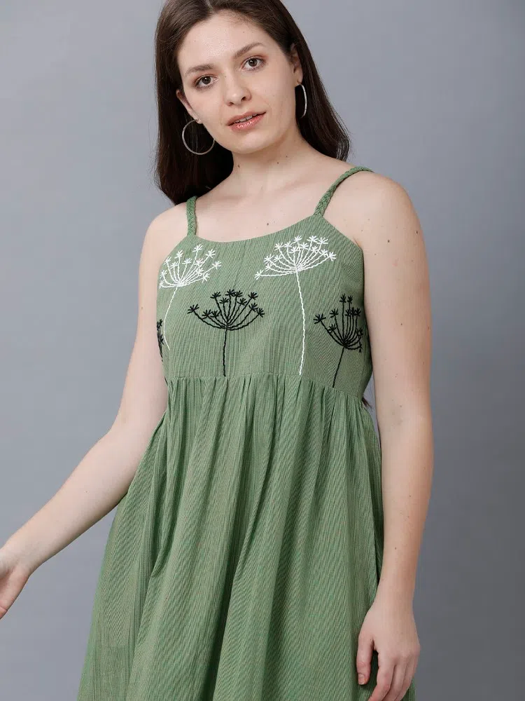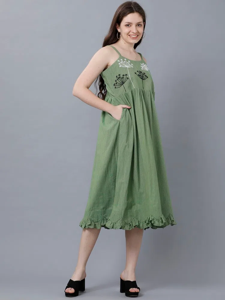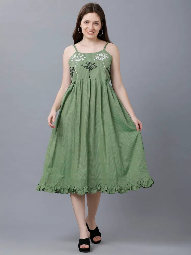 The Green Whisper Embroidery Dress is a beautiful representation of subtle charm and detailed craftsmanship. Made from soft mini checked cotton in a leaf green color, this dress mirrors the serene and fresh ambiance of a lush garden. The hand embroidery on the yoke showcases intricate botanical designs, adding a delicate and artistic touch to the piece. This spaghetti strap dress flows into a full, airy skirt, perfect for warm days or balmy evenings. The scalloped ruffle hem enhances the dress’s feminine appeal, making it sway gracefully with every movement. It’s an ideal choice for those looking for a blend of comfort, style, and uniqueness in their wardrobe. Whether attending a casual gathering, a daytime event, or a relaxed evening affair, the Green Whisper Embroidery Dress ensures you look effortlessly chic.