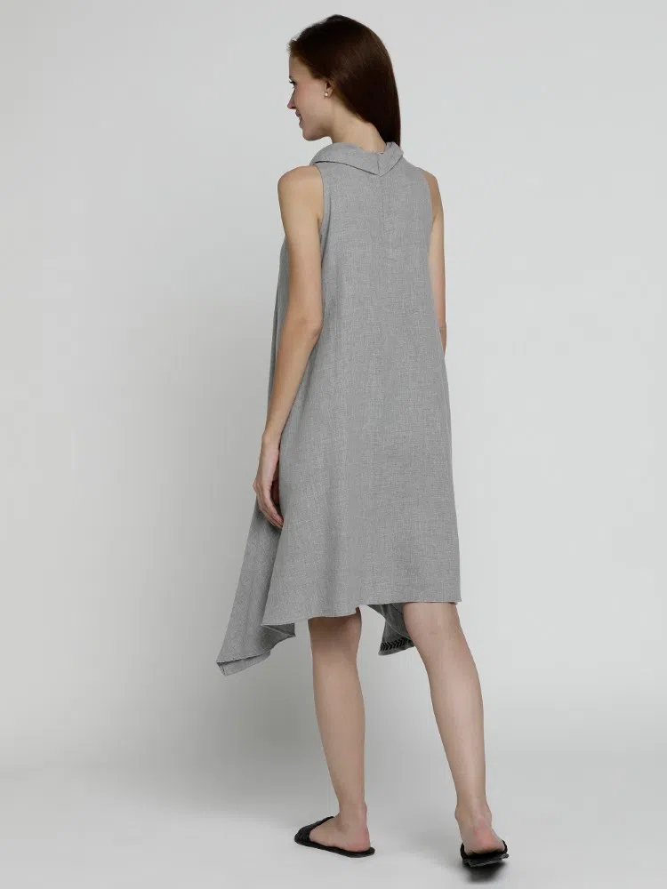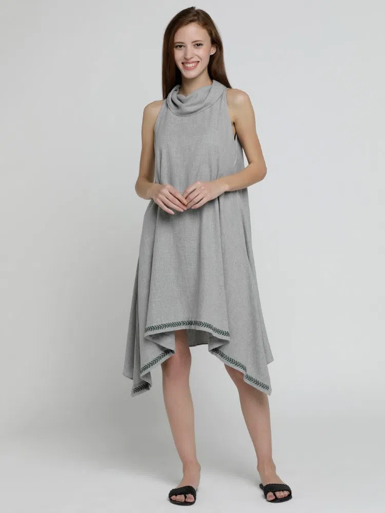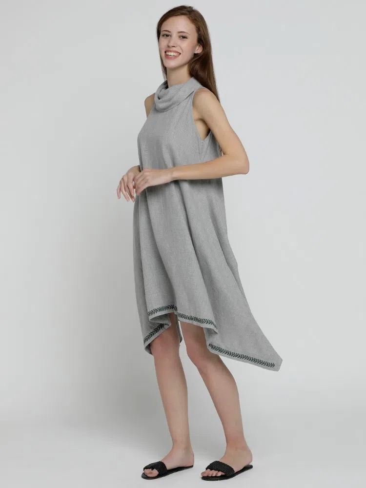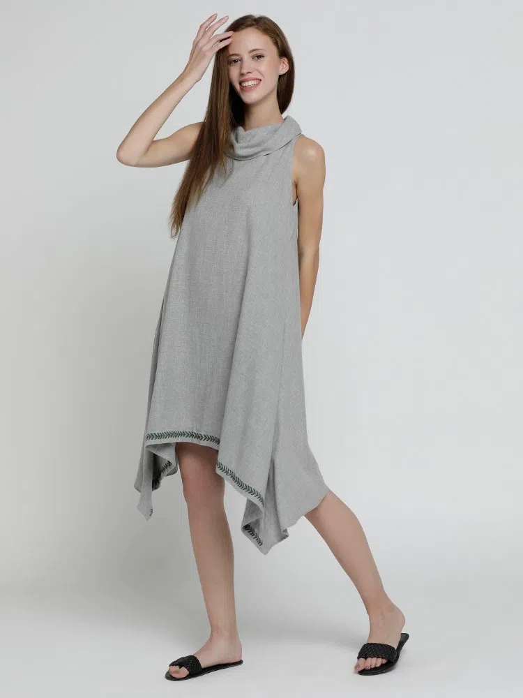 Ash grey asymmetrical dress with a unique zipper cowl neck, blending wool’s warmth with cotton’s softness for a stylish, versatile, and comfortable fit.