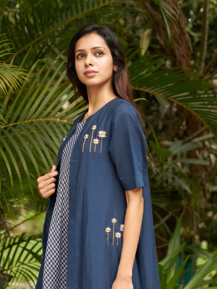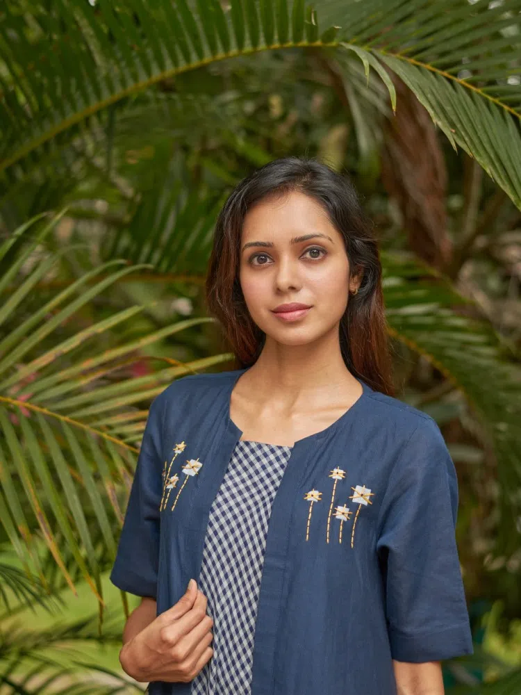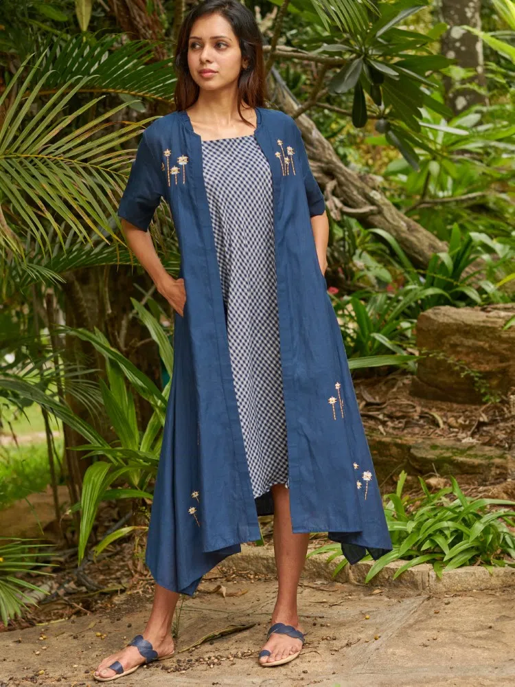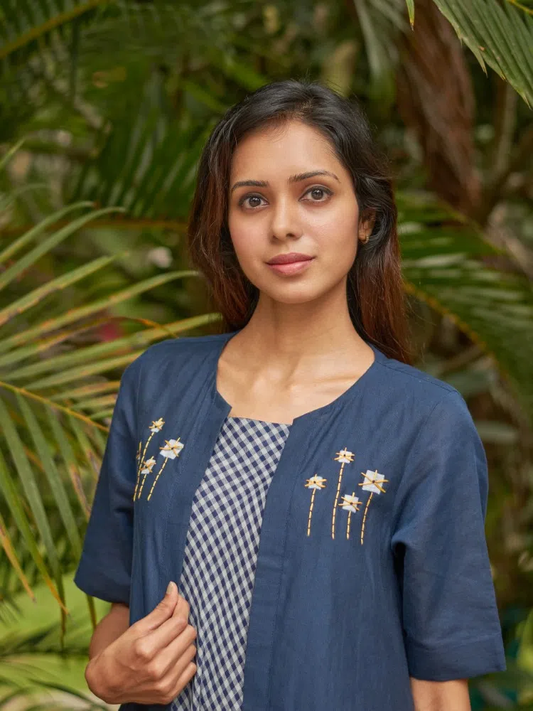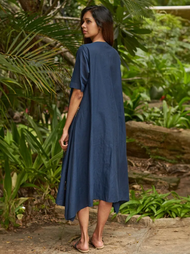 Discover the enchanting allure of our Indigo Rhapsody Linen Cotton Overlay, a garment that tells a story with its intricate block print and hand-embroidered details. The rich navy blue cotton linen fabric serves as a canvas for the traditional artistry, while the asymmetrical cut offers a modern twist that’s sure to turn heads. This overlay isn’t just a piece of clothing; it’s a celebration of craftsmanship and unique design. With its relaxed fit, it drapes effortlessly over your frame, promising comfort and style from day to night. Whether paired with slim-fit trousers for a polished look, or thrown over a casual dress for an evening out, the Indigo Rhapsody is a versatile statement piece that speaks to a refined, bohemian spirit.