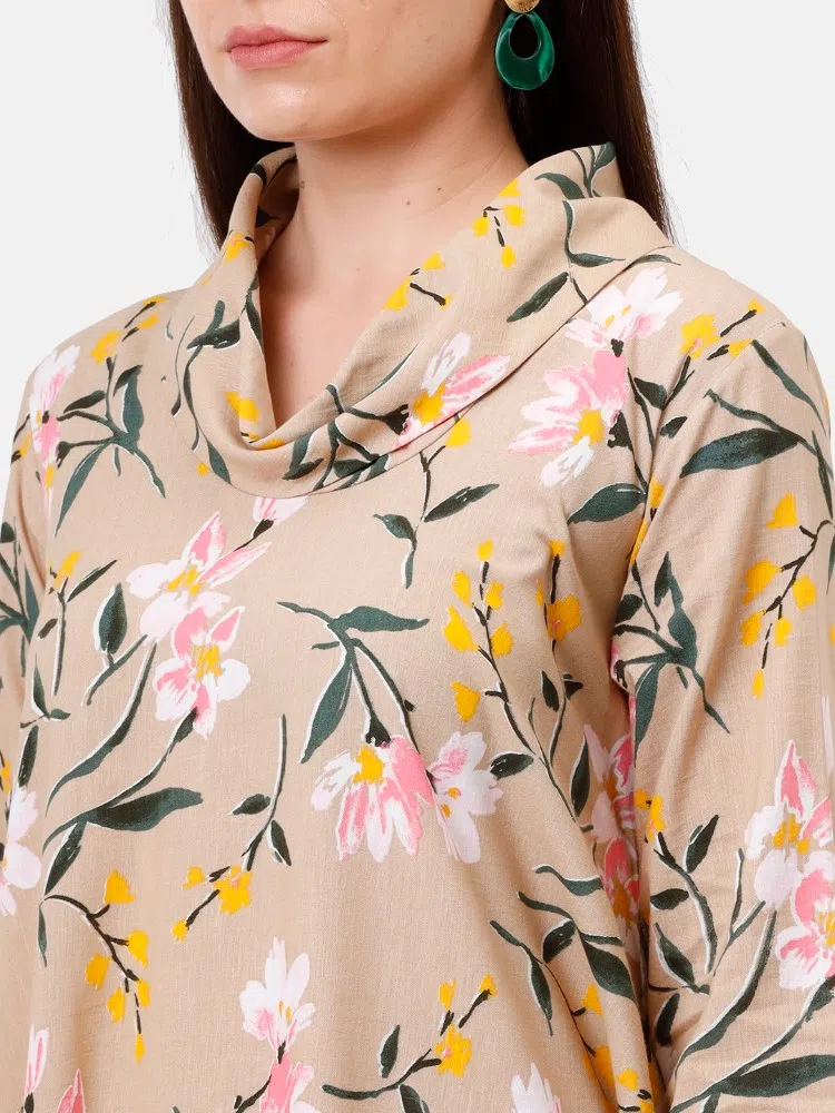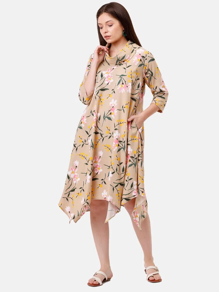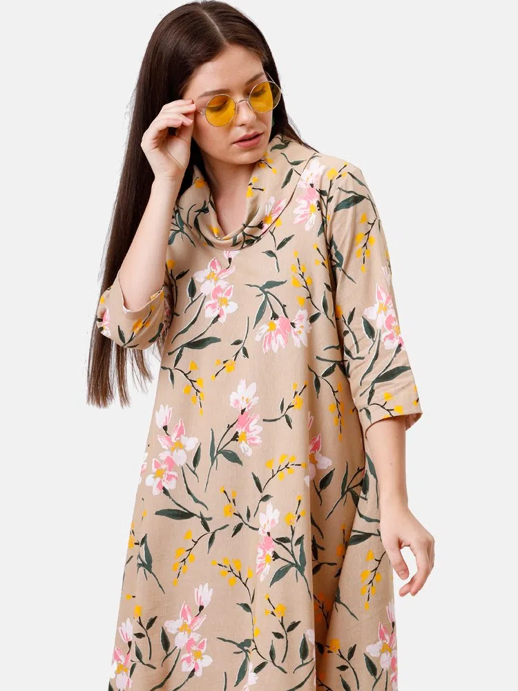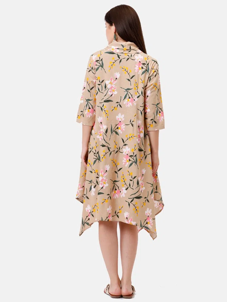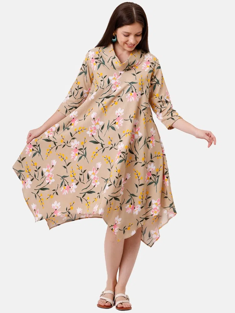 The Meadow Breeze Dress captures the essence of nature’s beauty through its exquisite beige floral pattern on soft bamboo cotton. This eco-friendly dress features a graceful cowl neck that enhances the neckline, complemented by an asymmetrical hem that adds a modern twist to this timeless piece. The fabric’s lightweight feel and breathable quality make it ideal for warmer days or outdoor events. Adorned with a charming floral print, this dress is perfect for those who appreciate a blend of sustainable fashion and elegant design. Whether it’s a garden party or a casual day out, the Meadow Breeze Dress offers a stylish way to enjoy the beauty of nature while looking effortlessly chic.