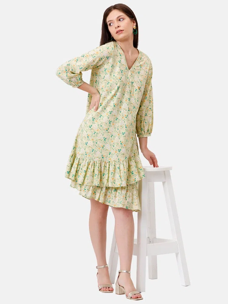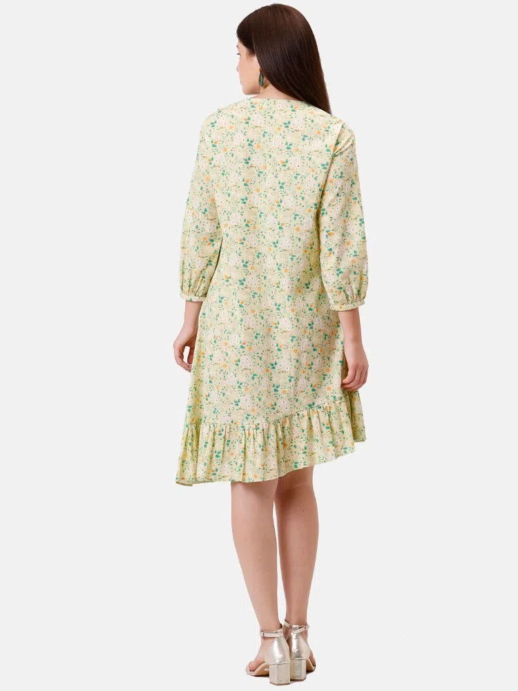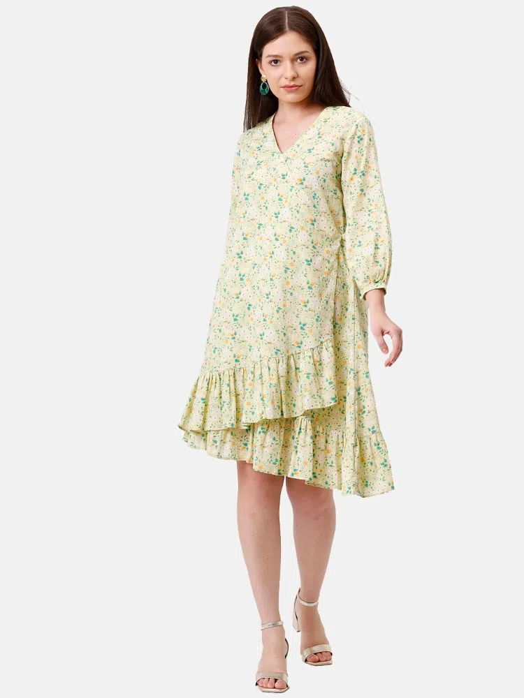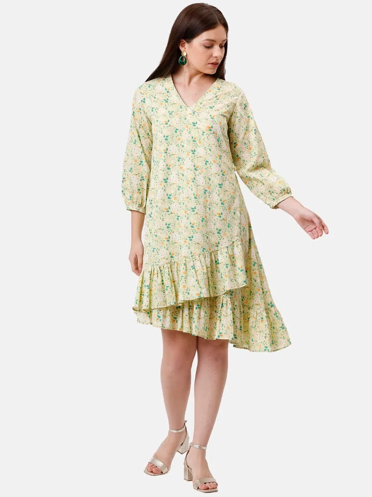 Embrace the playful charm of our ‘Meadow Breeze Ruffle Dress,’ a delightful expression of spring’s exuberance. This dress features an enchanting floral yellow print on crush cotton, giving you a breath of fresh air with every wear. The alluring V-neckline and overlapped high-low skirt are accentuated by ruffled hemlines that dance with the breeze. Whether you’re attending a garden party or enjoying a weekend getaway, this dress will add a touch of whimsy and comfort to your adventures. Its light fabric and flowy design ensure you stay cool and stylish throughout the warm season.