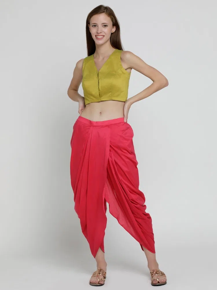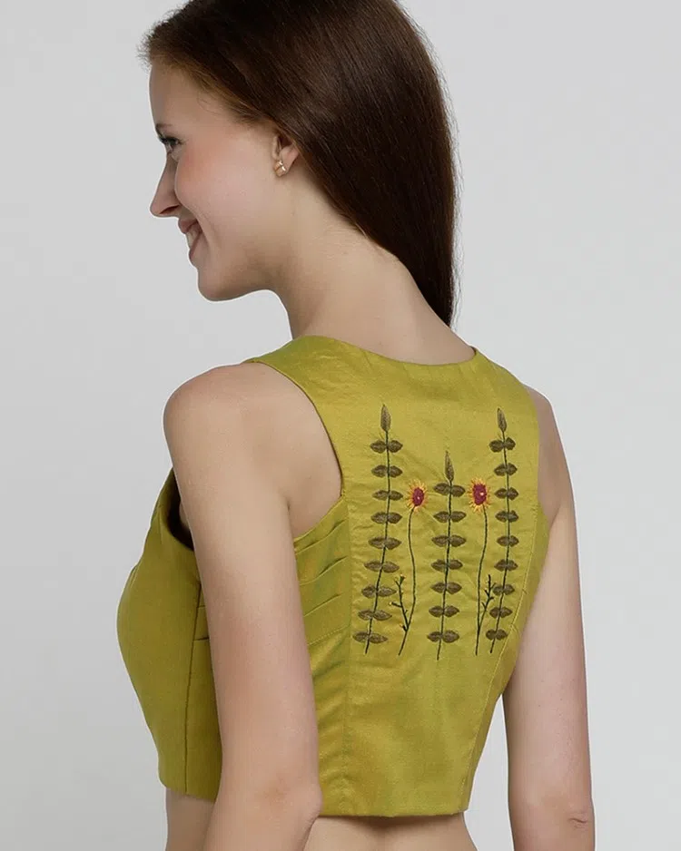 Introducing the “Mehendi Green Enigma Blouse,” a garment that seamlessly marries traditional elegance with a contemporary edge. This princess-cut blouse is fashioned from a rich cotton silk blend, offering a texture that’s both luxurious and comfortable. The mehendi green shade is reminiscent of earthy tones found in natural dyes, lending an organic charm to the piece. It features a front button closure that adds a touch of classic sophistication, while the square-cut racerback design provides a modern twist, accentuating the shoulders with an air of subtle allure. Delicate hand embroidery graces this blouse, showcasing meticulous craftsmanship. Perfect for pairing with a variety of bottom wears, from traditional sarees to chic palazzos, this blouse is a versatile choice for those who desire a hint of heritage in their contemporary wardrobe.
