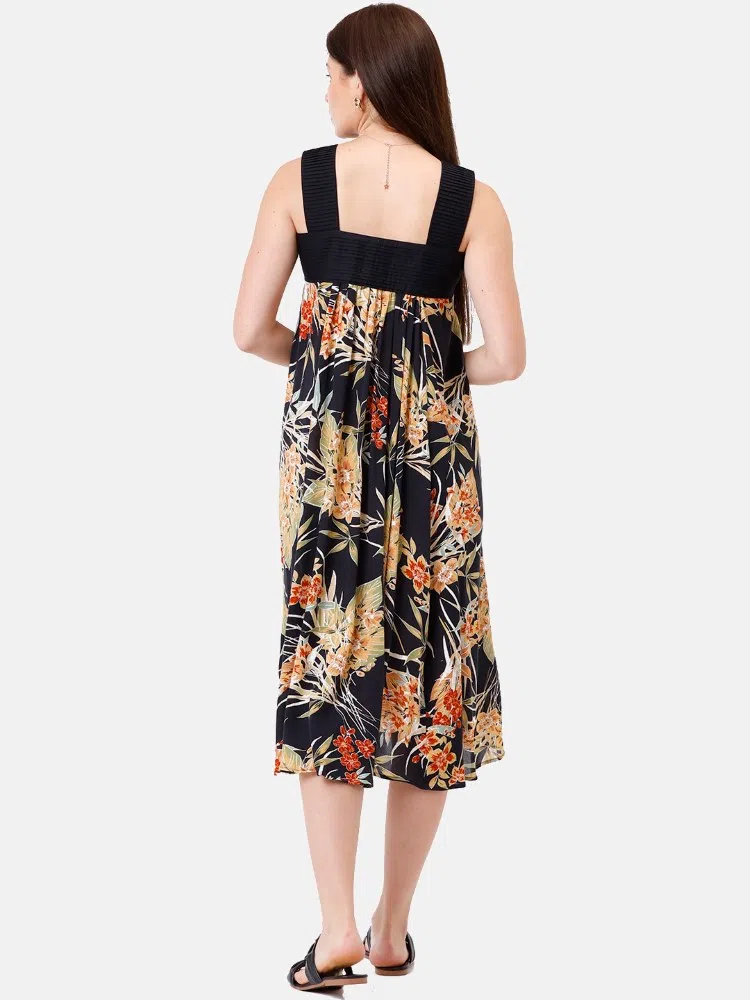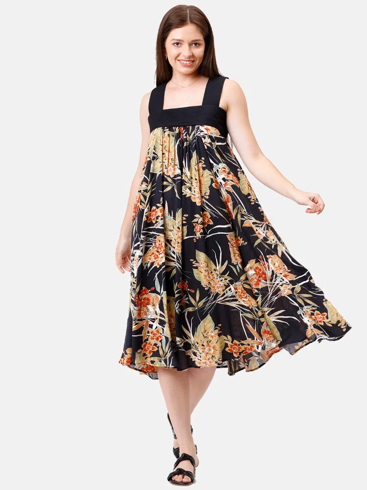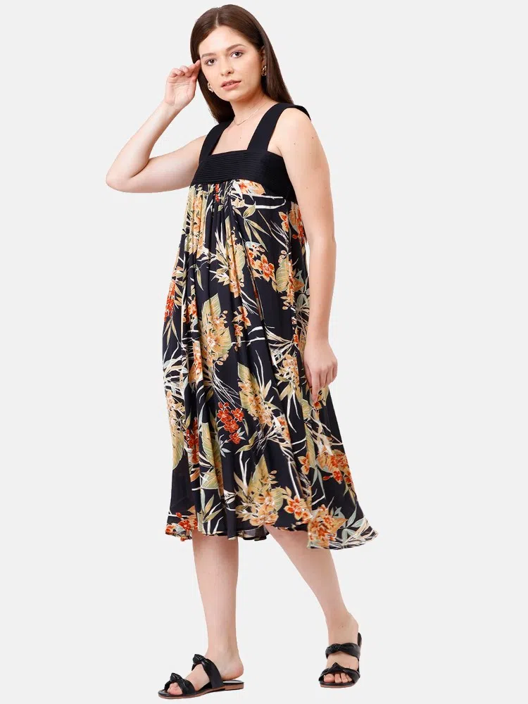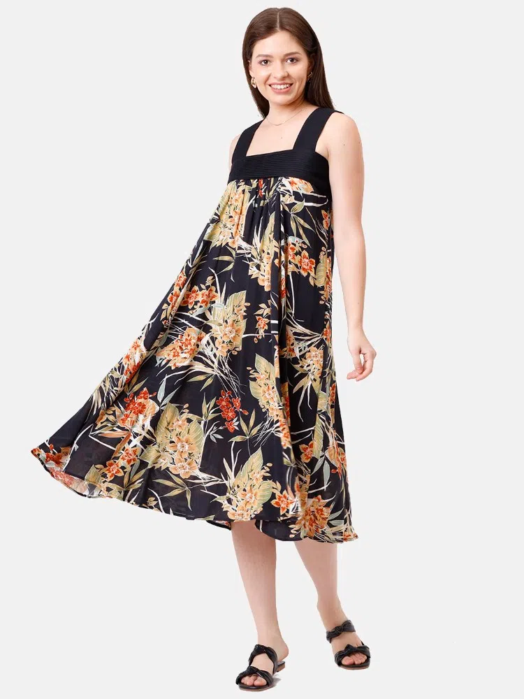 Embrace the charm of the ‘Midnight Blossom Pintuck Dress’, where the night’s mystery meets the allure of floral gardens. This crush cotton dress features a beautifully designed pintuck yoke that flows into a center-gathered panel cut, creating a silhouette that’s flattering for all. The adjustable straps ensure a perfect fit, while the panel cut offers a graceful flare. This dress is a testament to classic elegance with a touch of bohemian whimsy, ideal for evening events or casual outings where style is key.