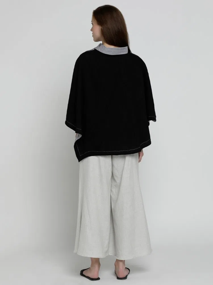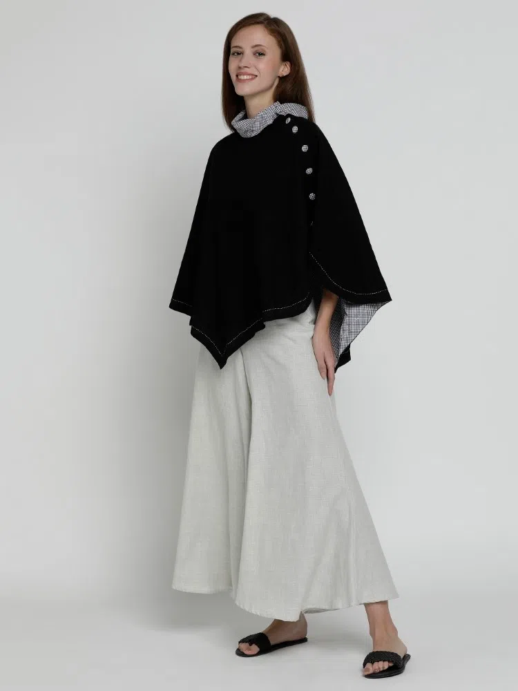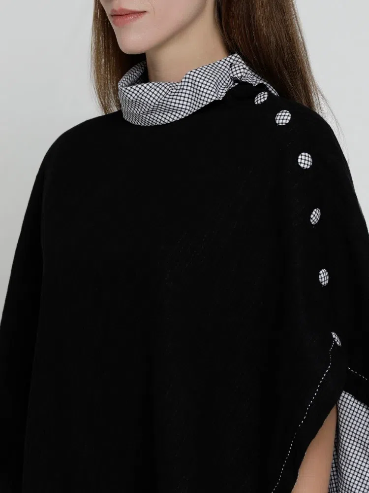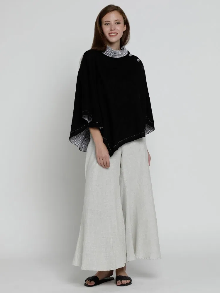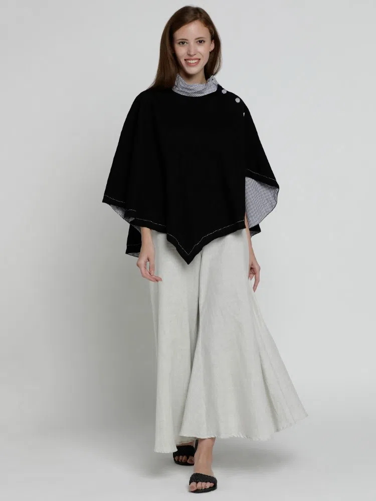 Wrap yourself in the timeless sophistication of our Midnight Elegance Cowl Neck Poncho. This exquisite piece is crafted from premium crush cotton, offering both warmth and a soft, tactile experience. The striking black color provides a versatile backdrop for any outfit, while the cowl neck design adds a touch of elegance. Accented with unique side shoulder buttons, this poncho exudes a blend of modern style and classic comfort. Whether you’re looking for an elegant layering piece for a cool evening or a stylish alternative to traditional outerwear, this poncho is the epitome of effortless chic. Make a statement with this versatile and fashionable addition to your wardrobe.