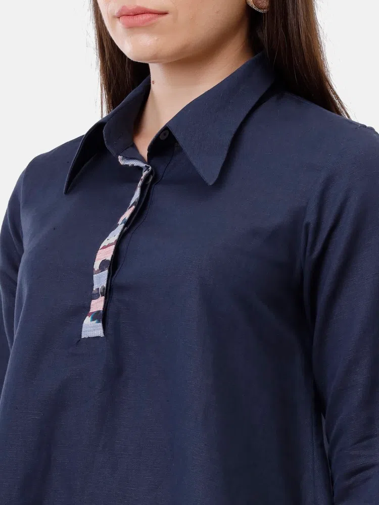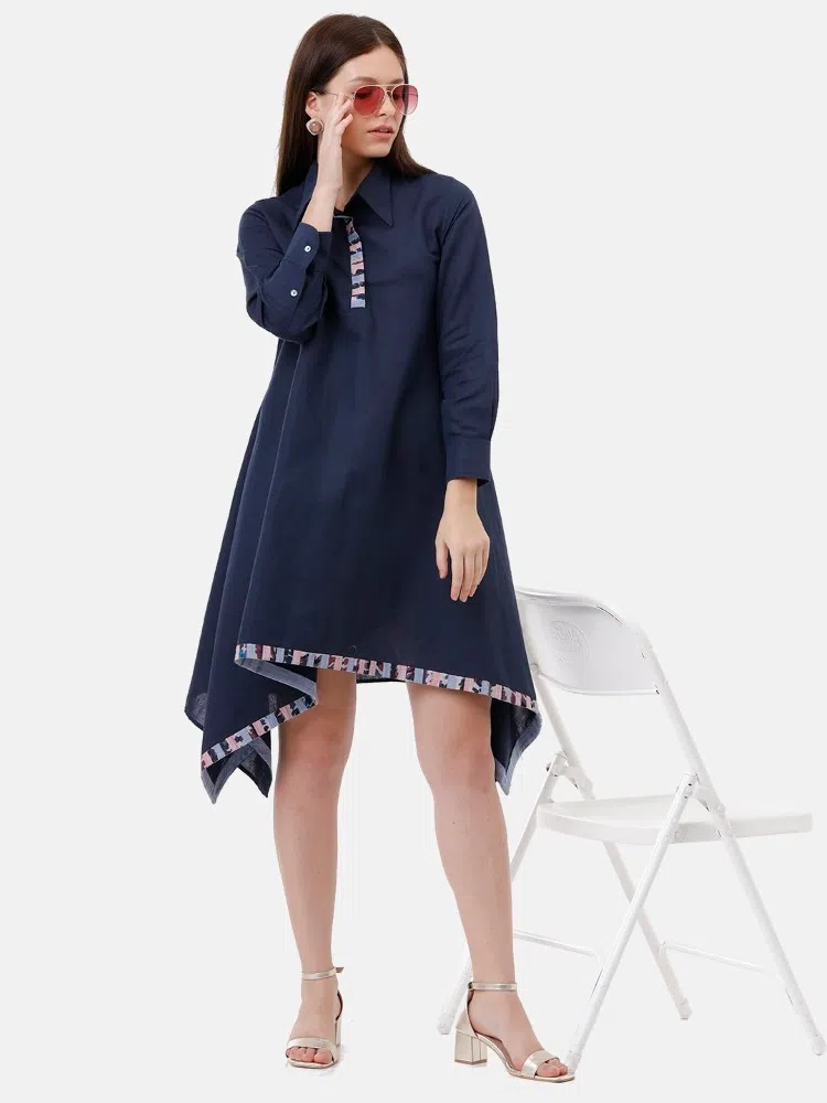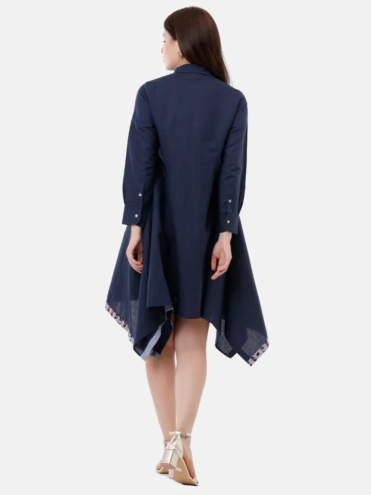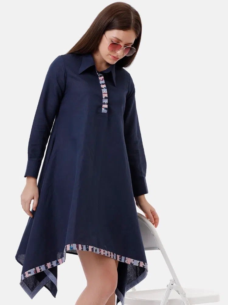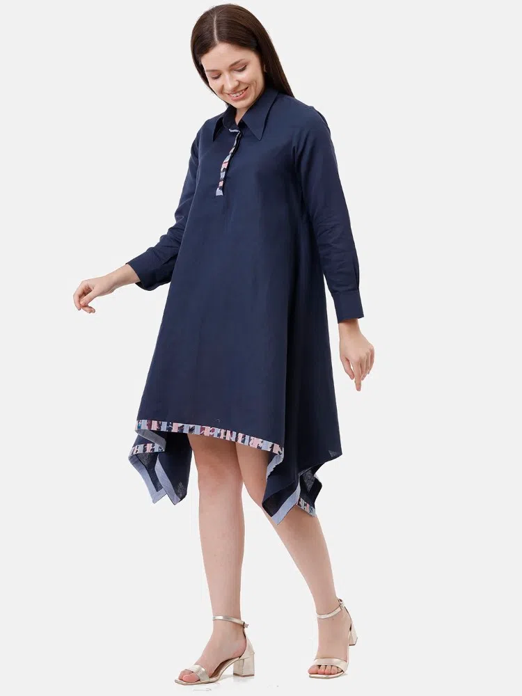 Reinvent your casual chic with the Midnight Muse Shirt Dress, where contemporary style embraces functional elegance. This dress is crafted from a premium cotton linen blend, offering both durability and comfort, ideal for the modern woman on the go. The navy blue hue is as versatile as it is classic, providing a rich backdrop for the asymmetrical hem that adds an avant-garde edge to this timeless piece. With its shirt-style top, complete with a smart collar and hidden button placket, this dress transitions effortlessly from a day at the office to an evening out. The playful hemline adds a dash of fun to the structured form, making it a standout piece that’s bound to turn heads.