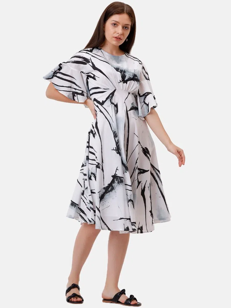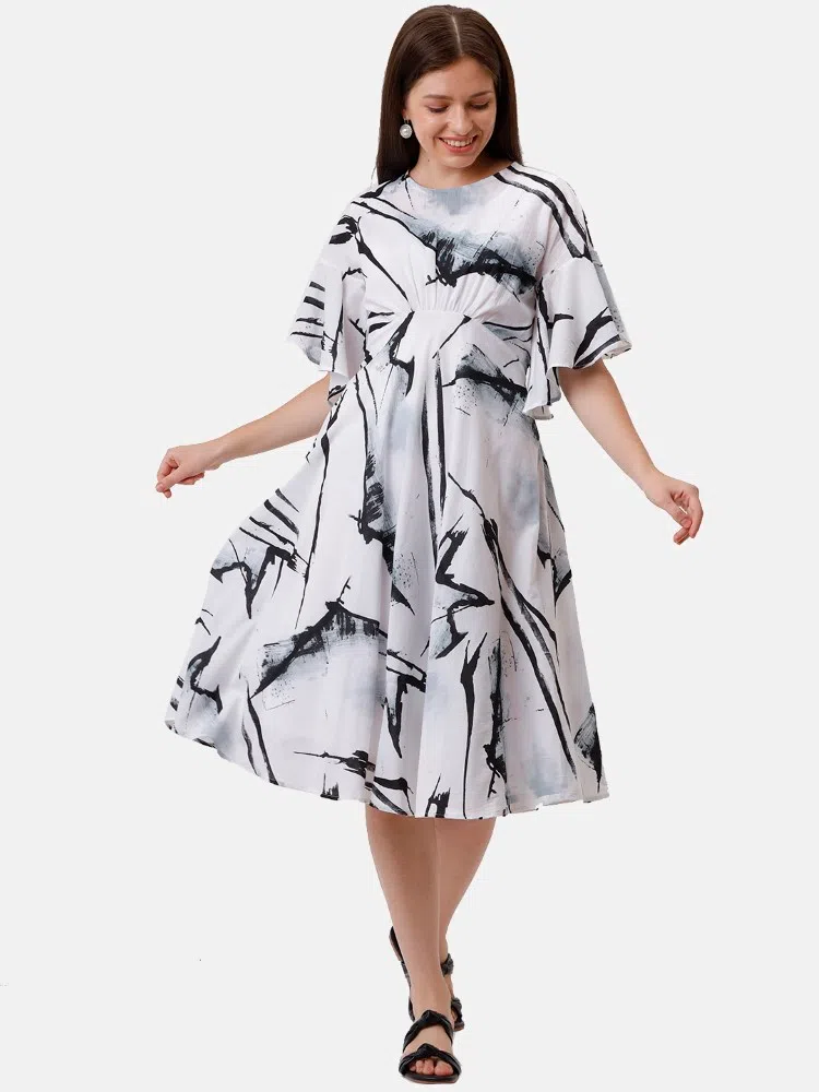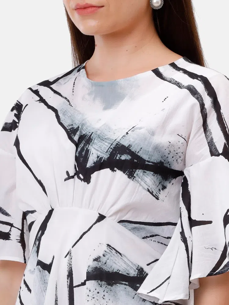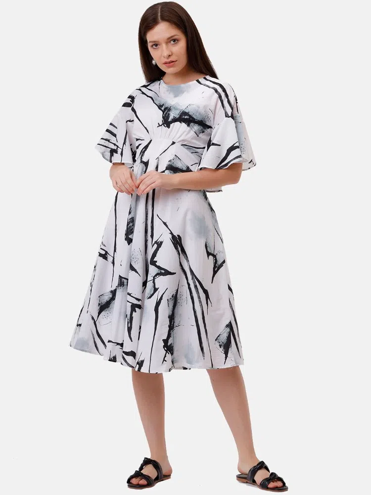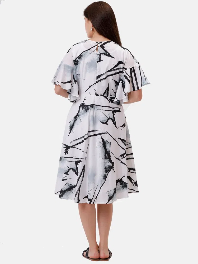 Make a statement with our Monochrome Muse Flare Dress, where bold patterns meet classic elegance. Crafted from soft cambric cotton, this dress promises both style and comfort, making it a versatile choice for any season. The abstract black brush strokes on a white canvas are reminiscent of an artist’s masterpiece, ensuring you’ll stand out in any crowd. The bias cut flatters the figure while allowing the fabric to drape gracefully, enhancing the flare of the sleeves and the swing of the skirt. The center gathering at the neckline creates a focal point that is both flattering and artistic. This dress is perfect for those who appreciate a touch of drama in their wardrobe. Style it with black ankle boots and silver jewelry for an edgy look, or with ballet flats for a more subdued elegance.