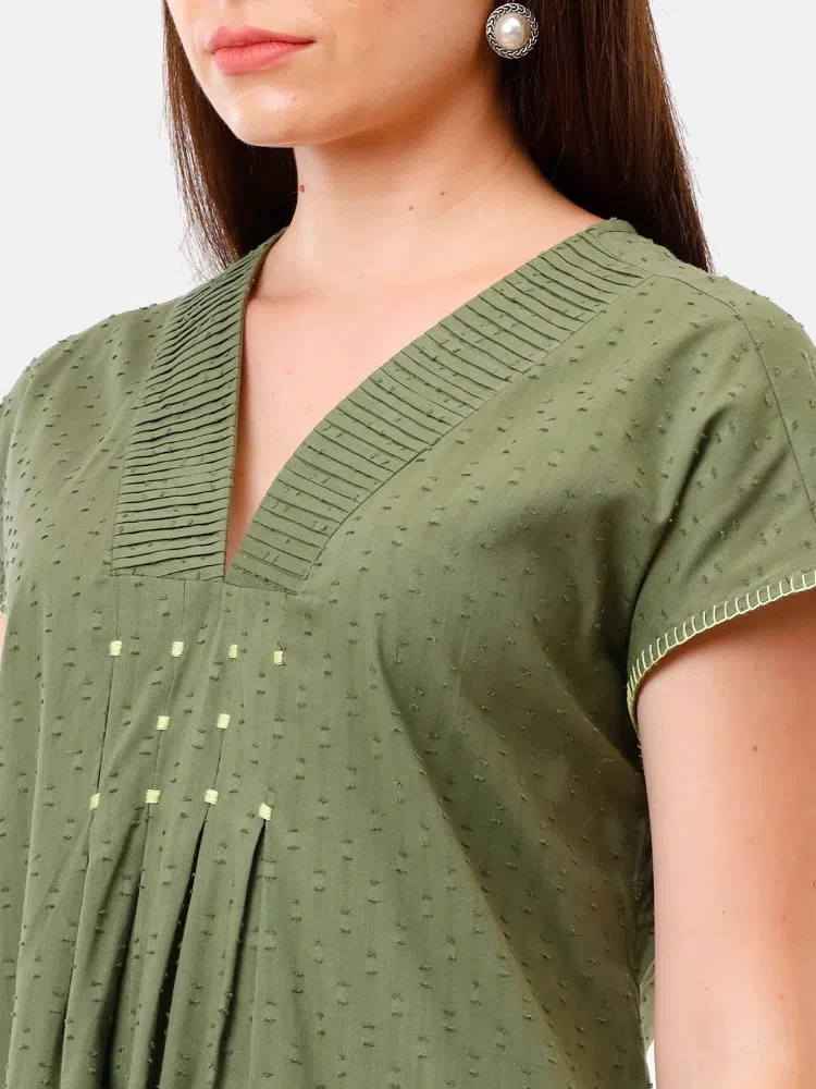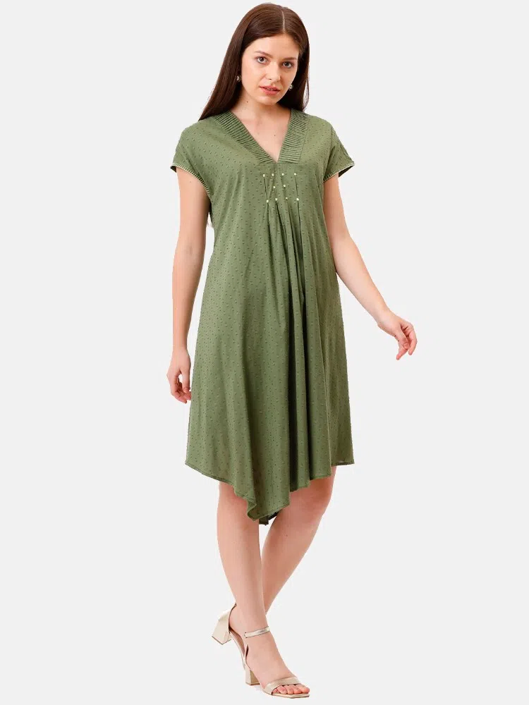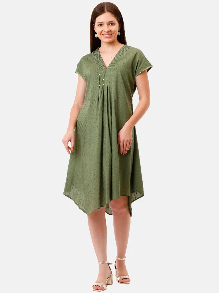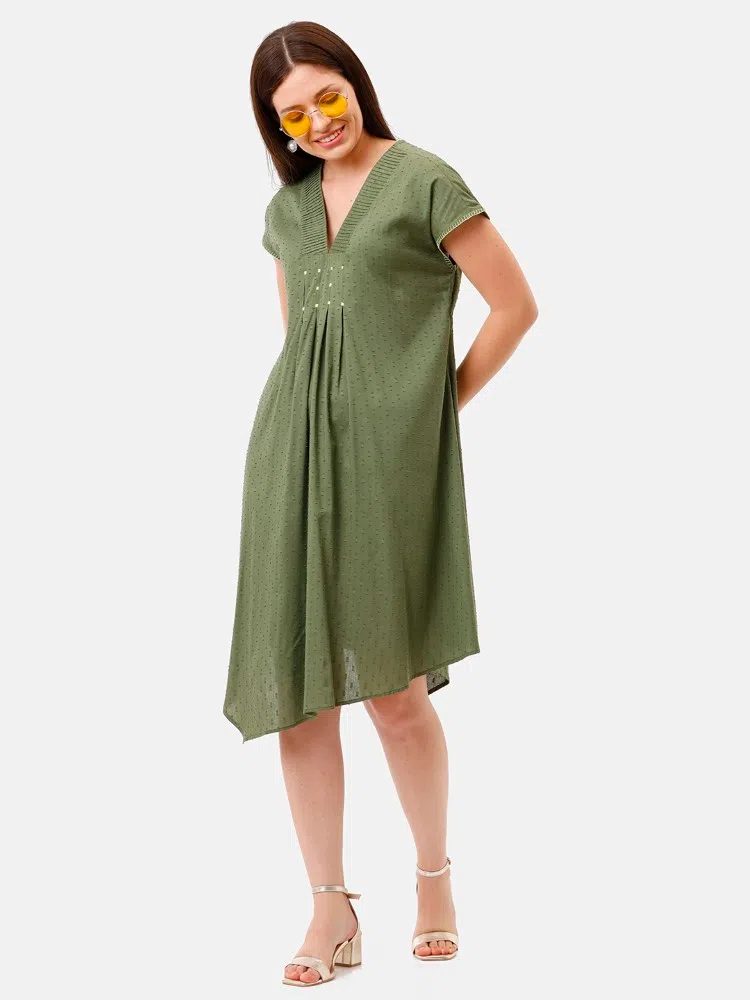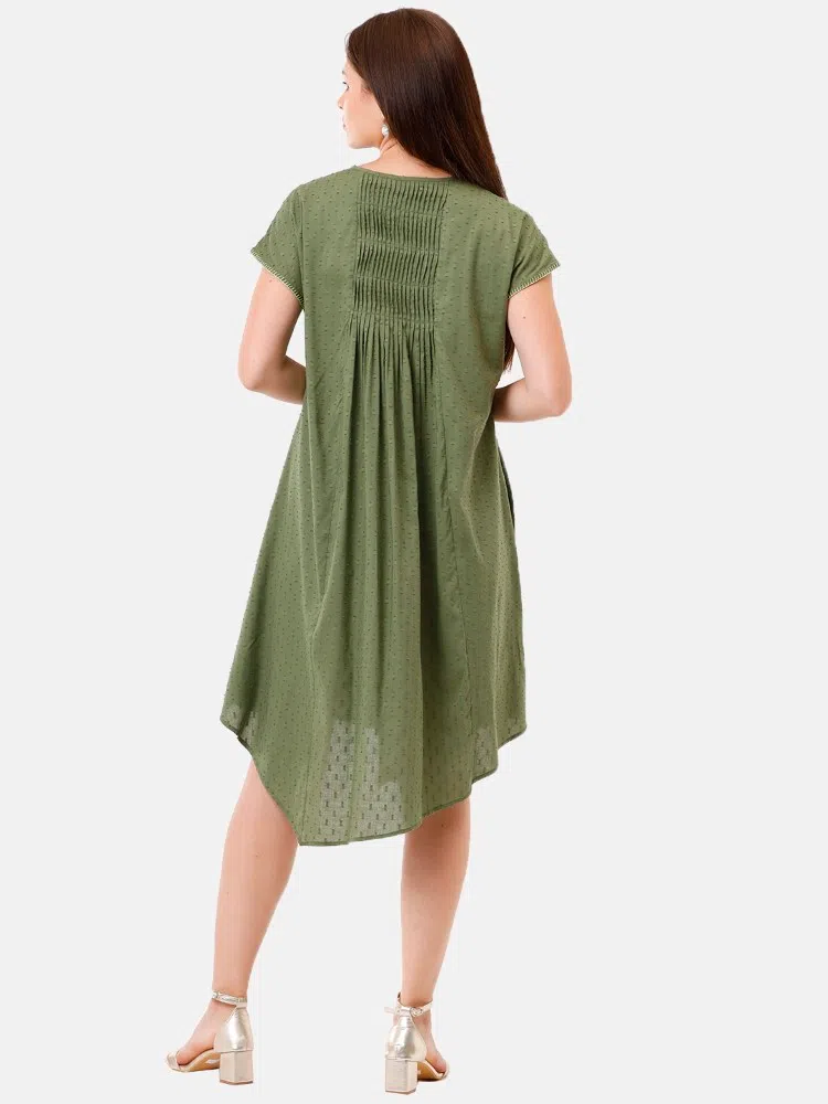 Embrace a blend of casual sophistication with our Olive Whisper Dress, crafted from premium textured cotton. This dress features a rich olive green tone that complements a variety of accessories and styles, making it a versatile choice for any wardrobe. The pintuck neckline adds a touch of refined detail, while the freestyle back detailing and inverted pleats create a flowing, comfortable silhouette that moves with you. Whether you’re attending a casual gathering or dressing up for an evening out, this dress combines comfort with understated elegance to ensure you always look and feel your best.