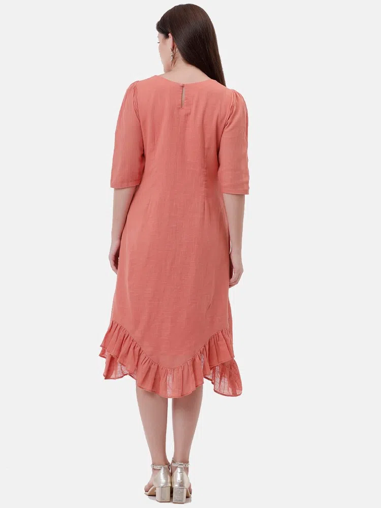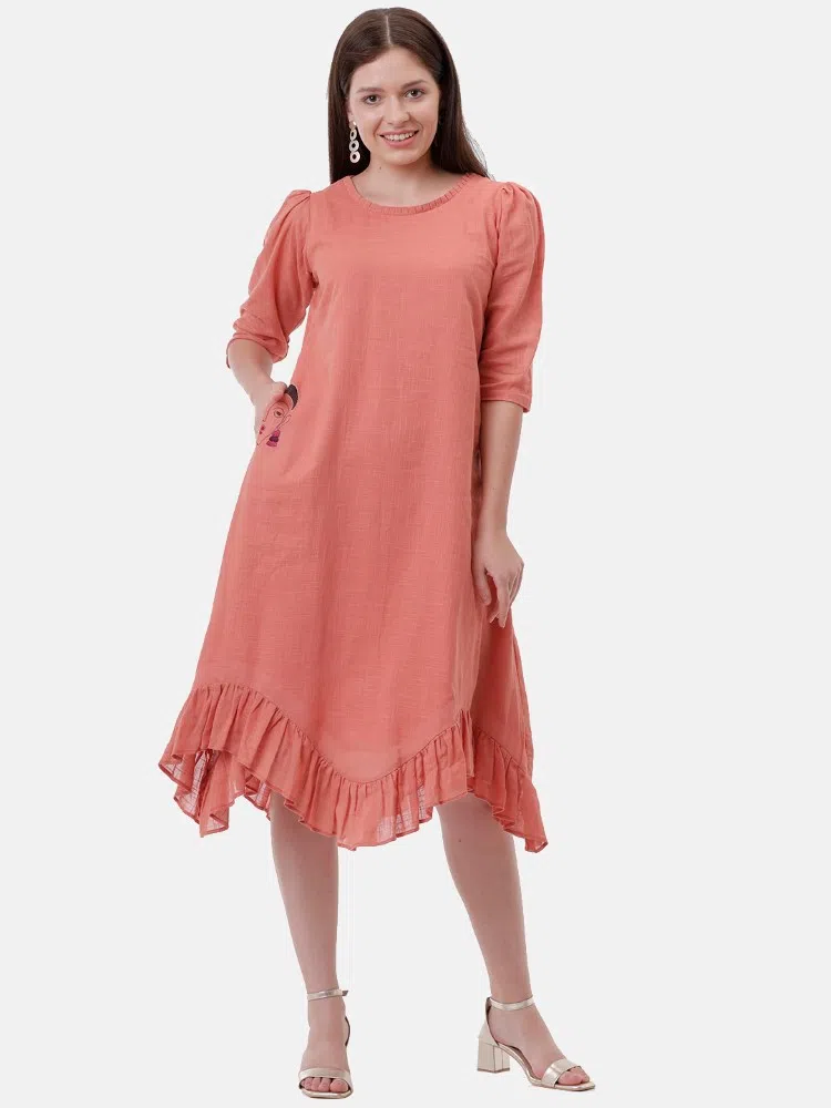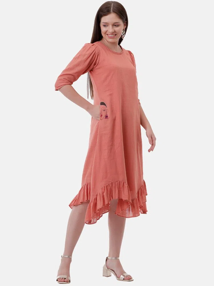 Discover the perfect blend of style and comfort with our Peach Blossom Ruffle Dress. Crafted from premium cotton slub, this dress ensures breathability and durability, ideal for any season. The eye-catching peach hue paired with a hand-painted finish adds an artistic touch to your wardrobe, making each piece uniquely yours. The wavy ruffle hem introduces a playful, yet sophisticated silhouette that flows gracefully with every step. Whether it’s a casual outing or a special event, this dress promises to enhance your elegance and stand out in style.