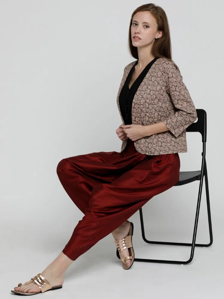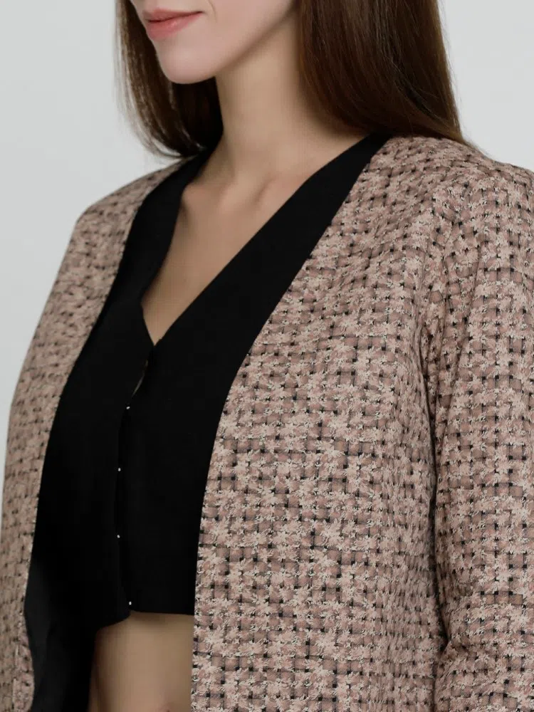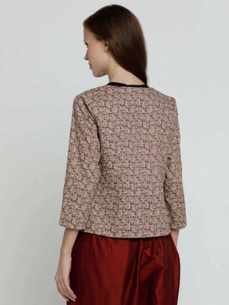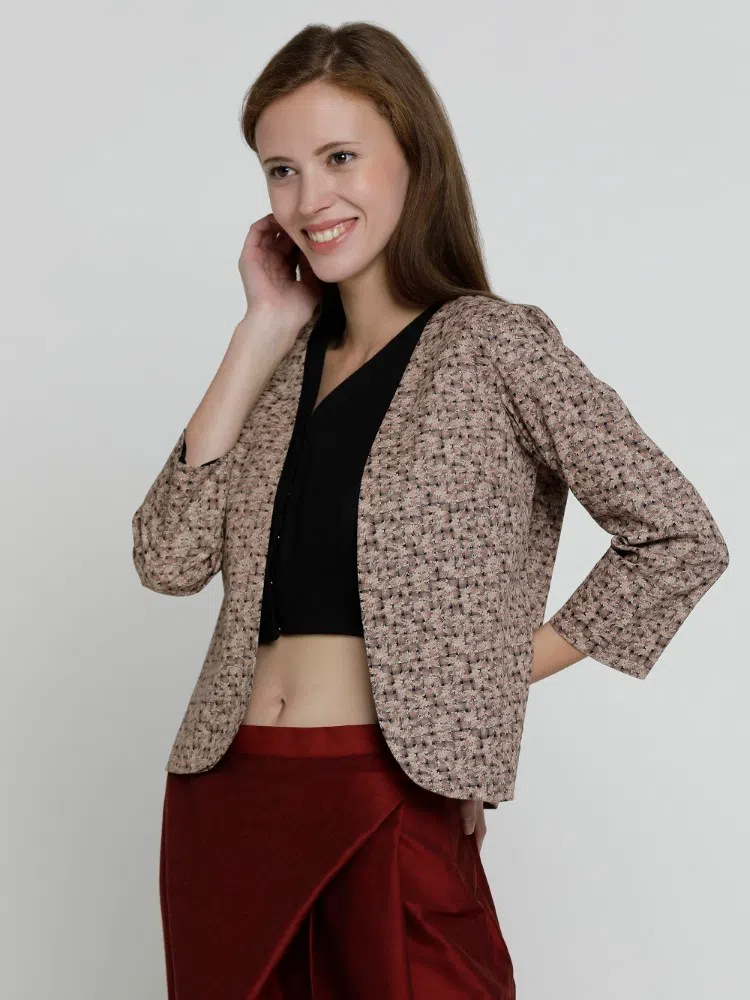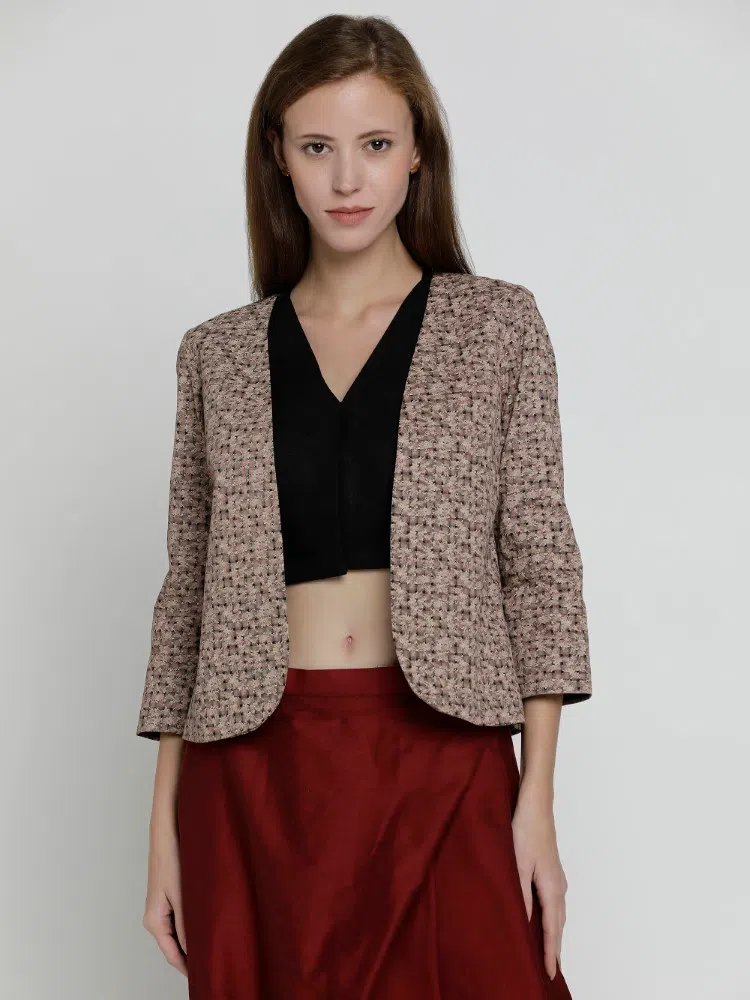 The “Peach Whisper Fine Cotton Jacket” is an embodiment of elegance in a semi-formal attire. Crafted from fine cotton, this jacket offers a soft touch and comfortable wear, perfect for those long office hours or casual business meetings. Its sophisticated fleshtone hue is versatile and brings a warm, subtle lift to any ensemble. The jacket’s design boasts a neat, structured cut that aligns with a semi-formal aesthetic, providing a polished look without being overly formal. The three-quarter sleeves and open front lend a contemporary feel to the traditional jacket, making it a stylish choice for the modern professional. Pair it with tailored pants or a chic pencil skirt to complete a look that’s both classy and effortless.