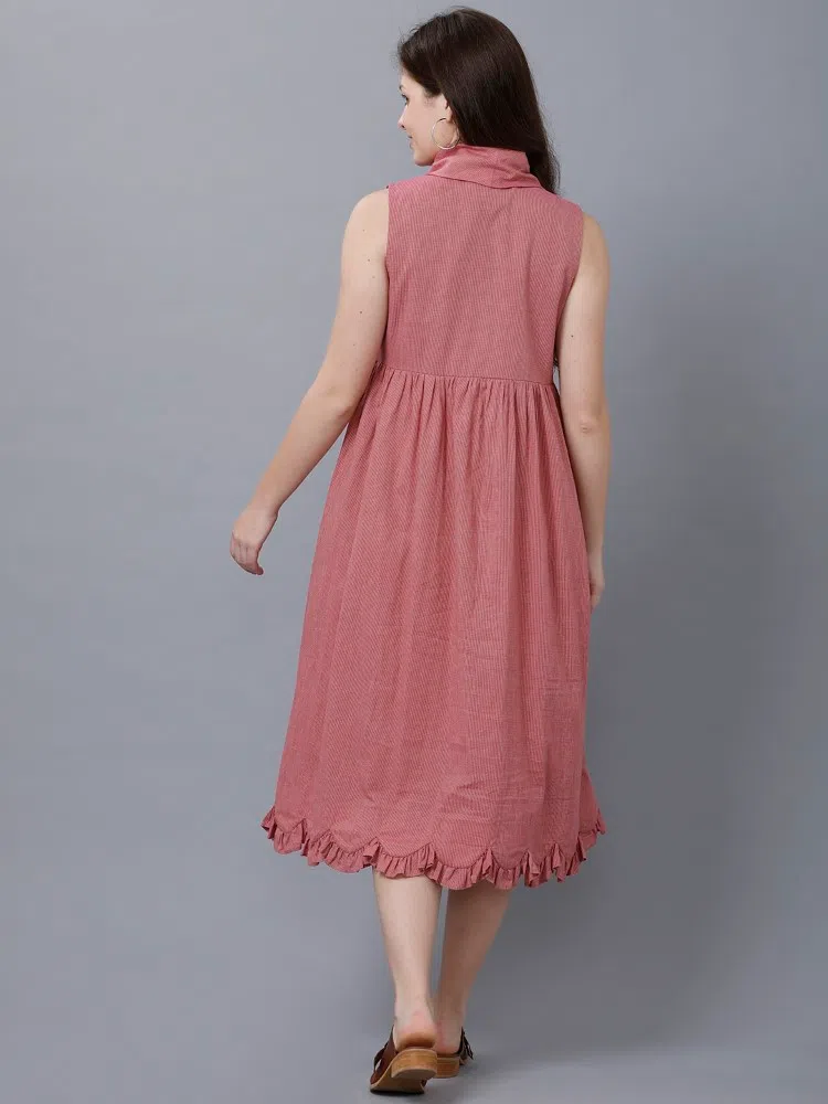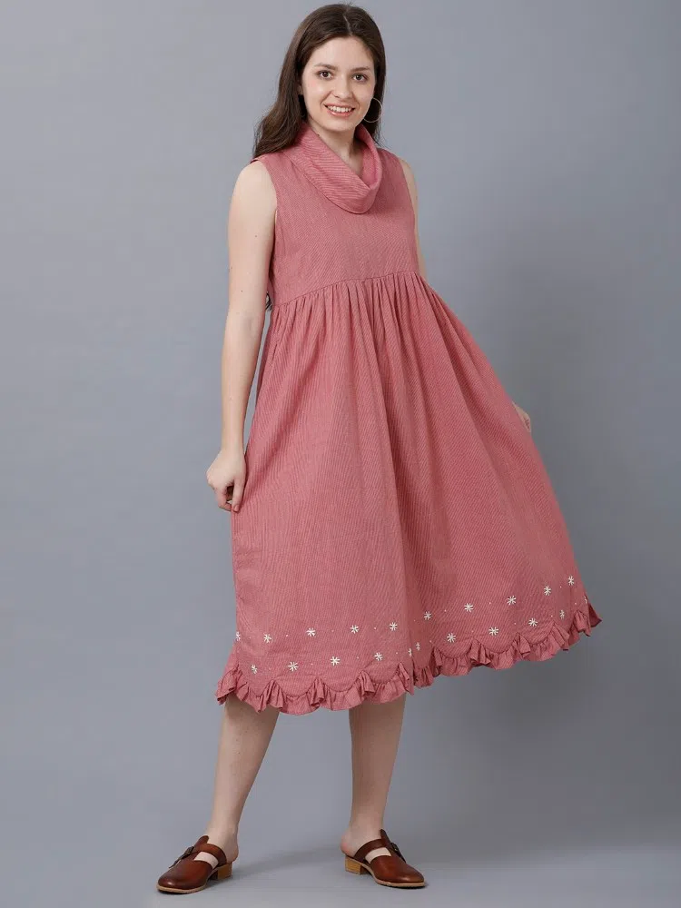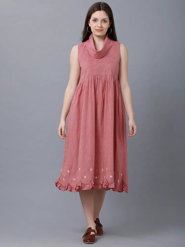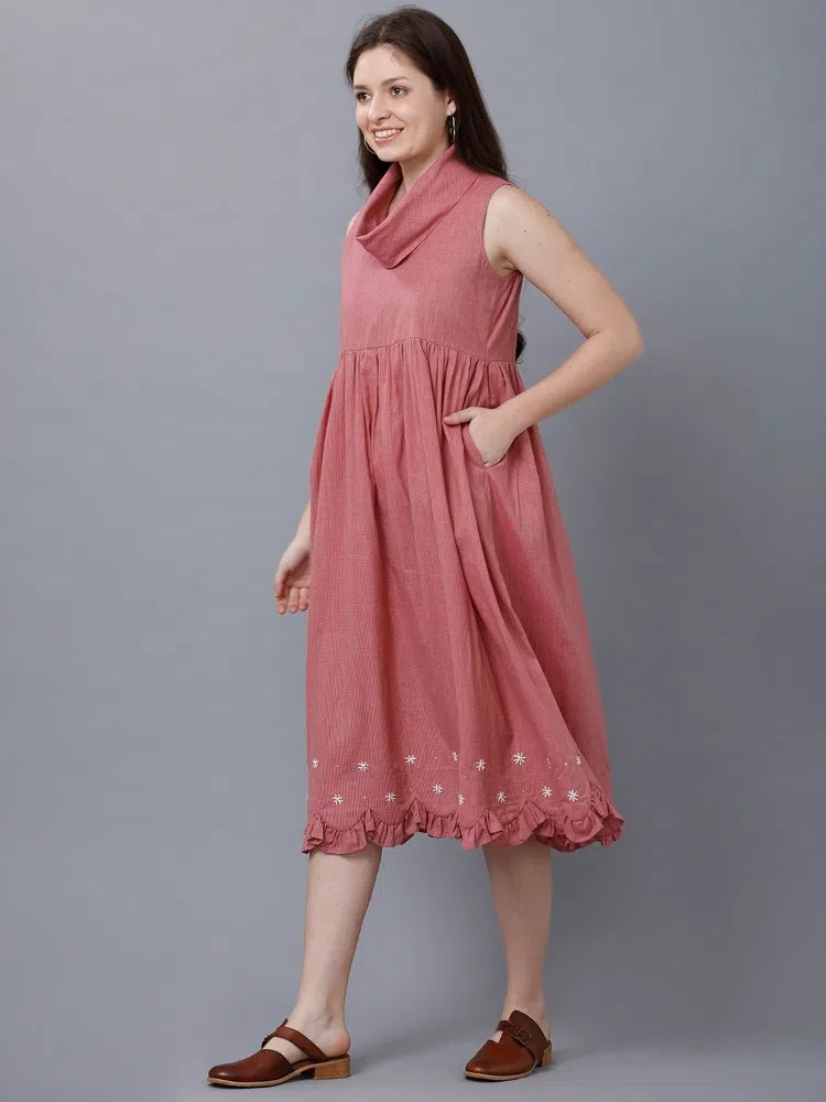 The Pink Petal Embroidered Dress brings a breath of fresh air to classic femininity with its subtle yet stunning details. Crafted from soft mini checked cotton, this dress offers comfort and a gentle texture that complements its delicate pink hue. The cowl neck design adds a modern touch, while the scallop ruffle hem infuses a playful, romantic flair to the overall look. Hand-embroidered floral motifs delicately adorn the hem, lending an artisanal quality that makes each dress uniquely beautiful. Perfect for spring gatherings, casual outdoor weddings, or a day at the museum, this dress pairs effortlessly with sandals for a relaxed look or with heels for a more elevated ensemble.