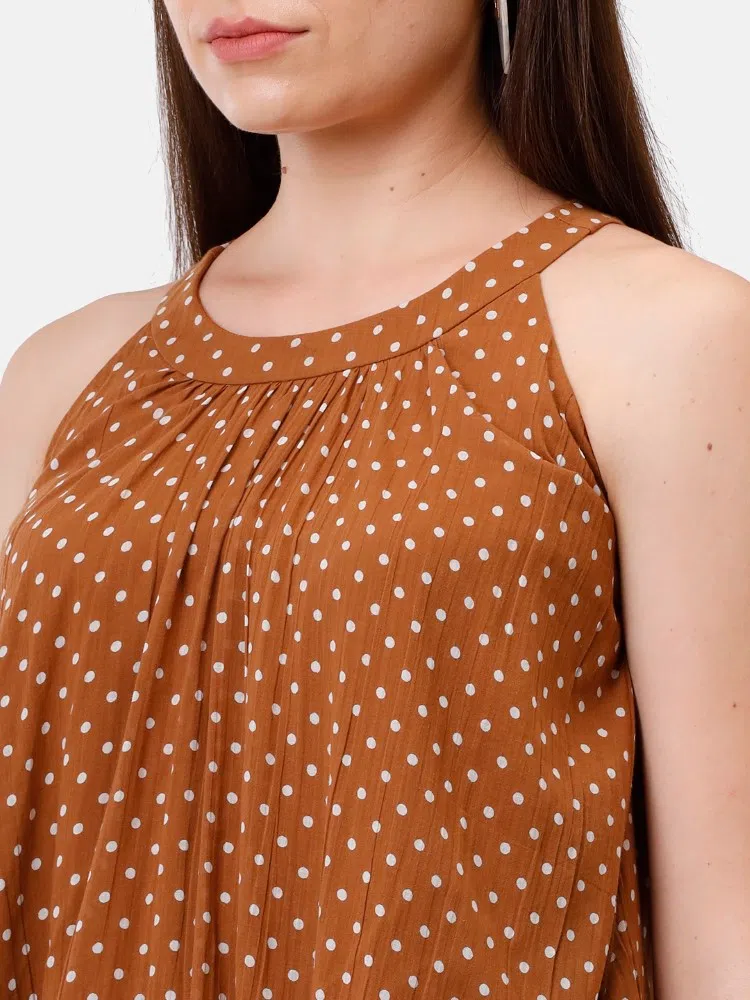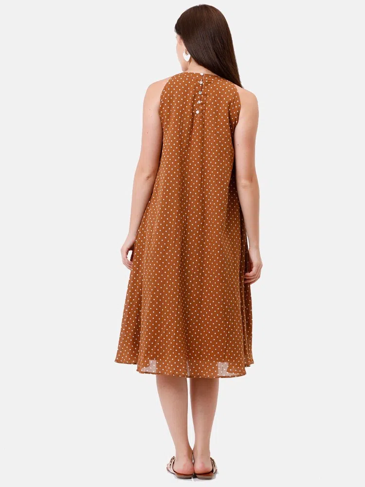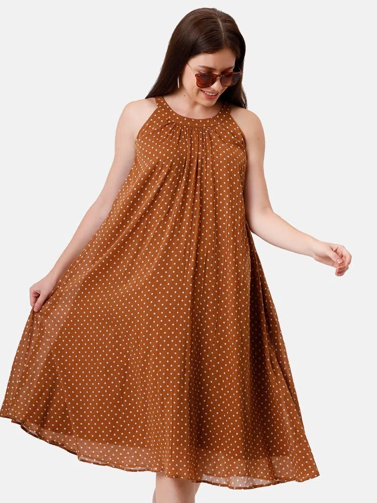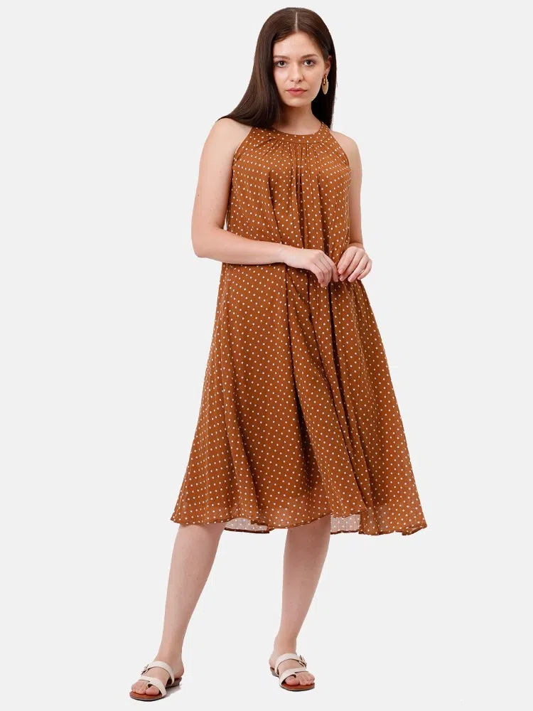 Channel the timeless charm of polka dots with our Polka Grace Halter Dress, a garment that exudes vintage flair with a modern twist. This dress is crafted from the finest mul fabric, known for its lightness and breathability, making it a delightful choice for warm weather. The mud brown backdrop dotted with crisp white polka dots offers a playful yet poised look, perfect for both daytime picnics and evening escapades. The halter neck design adds a touch of sophistication, while the center-gathered detail creates a flattering, fluid drape that sways with every step. The knee-length cut makes it versatile and suitable for various occasions, from casual outings to more formal events. Pair this dress with white sandals and a sun hat for a daytime look, or with heels and a clutch for an evening out.