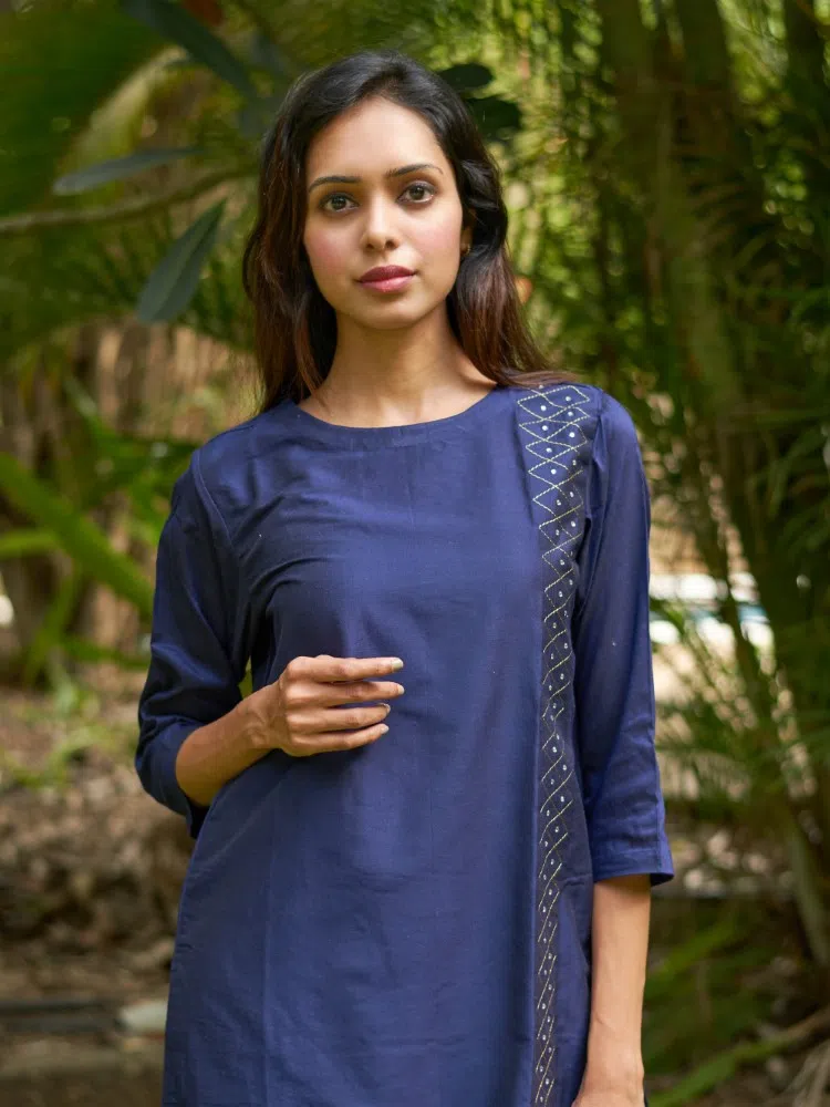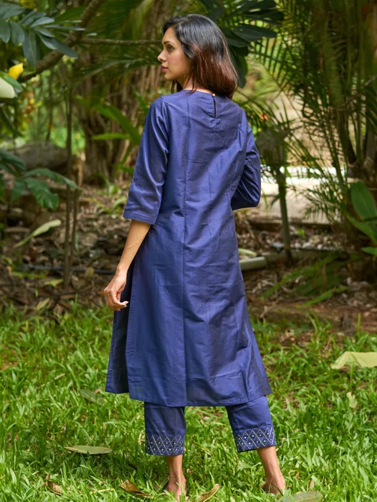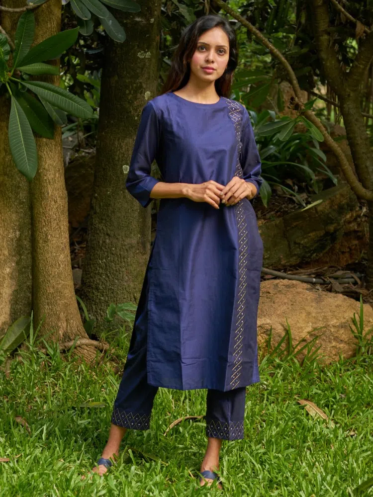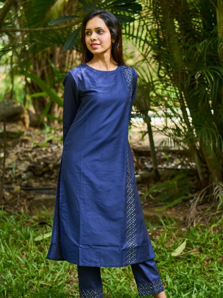 Our Sapphire Stitchwork Elegance Set redefines traditional style with its luxurious navy blue cotton silk fabric, enriched with the glimmer of gold thread running stitch and the subtle shine of stone work. The kurti boasts a straight-cut design that flatters every figure, while the intricate stitchwork along the sleeves and hem adds depth and dimension to this classic silhouette. Paired with coordinating pants, this set is a harmonious blend of comfort and ceremonial grace. Ideal for festive occasions or formal gatherings, the Sapphire Stitchwork Set is your go-to choice for an ensemble that speaks volumes of your refined taste and love for detailed craftsmanship.