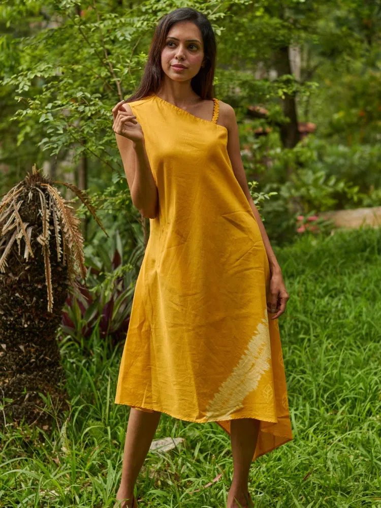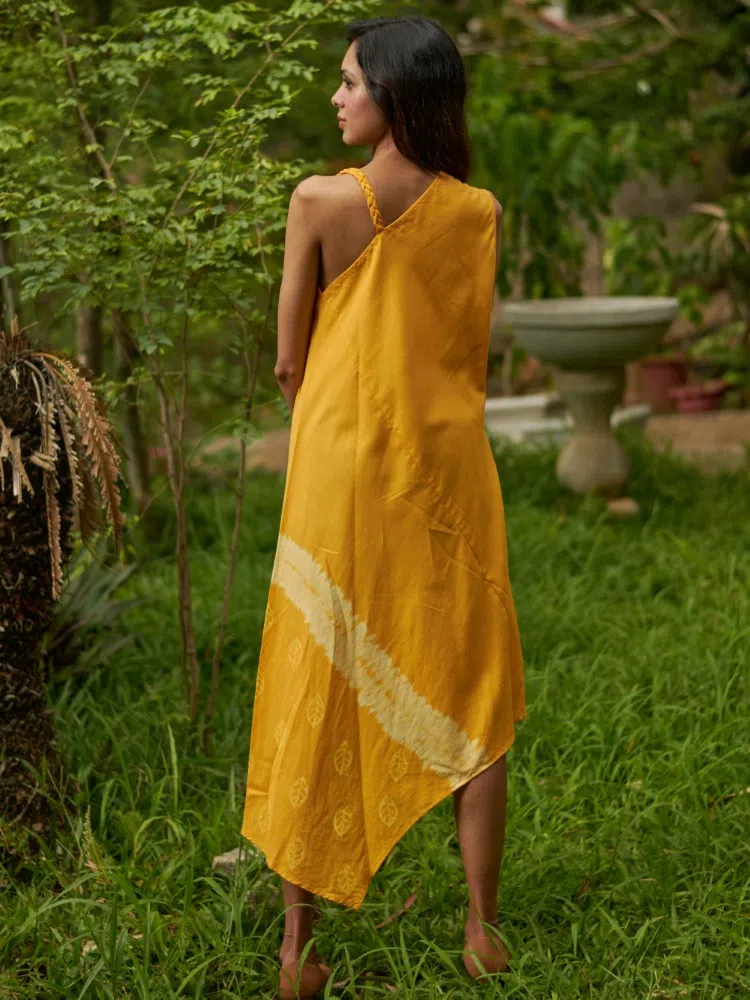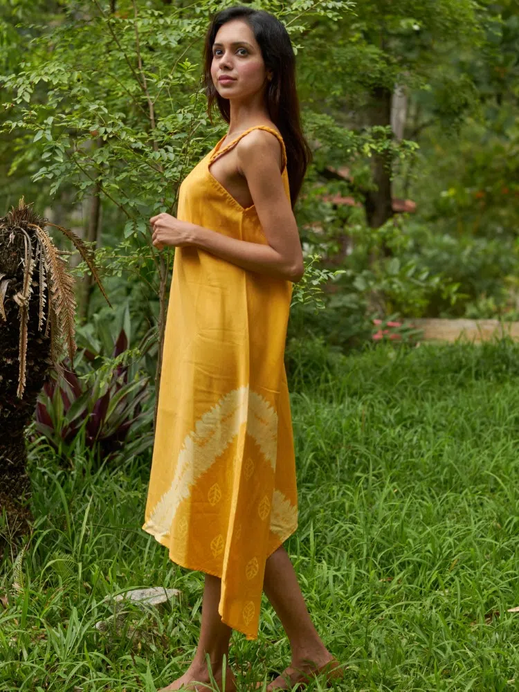 The sunny yellow hue is accented with artisanal block prints and an eye-catching tie-dye pattern, creating a visual symphony that mirrors the vibrant energy of summer. Whether you’re strolling through a weekend market or enjoying an evening soiree, this dress will wrap you in comfort while exuding a charismatic charm that’s simply irresistible. Add a touch of sun-kissed radiance to your wardrobe with this one-of-a-kind piece that’s designed to celebrate you.