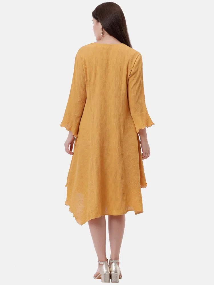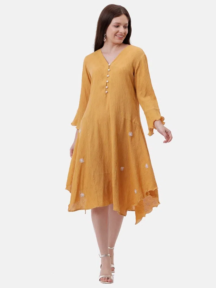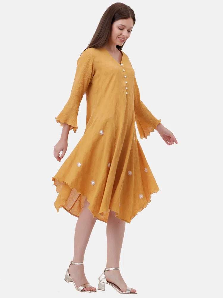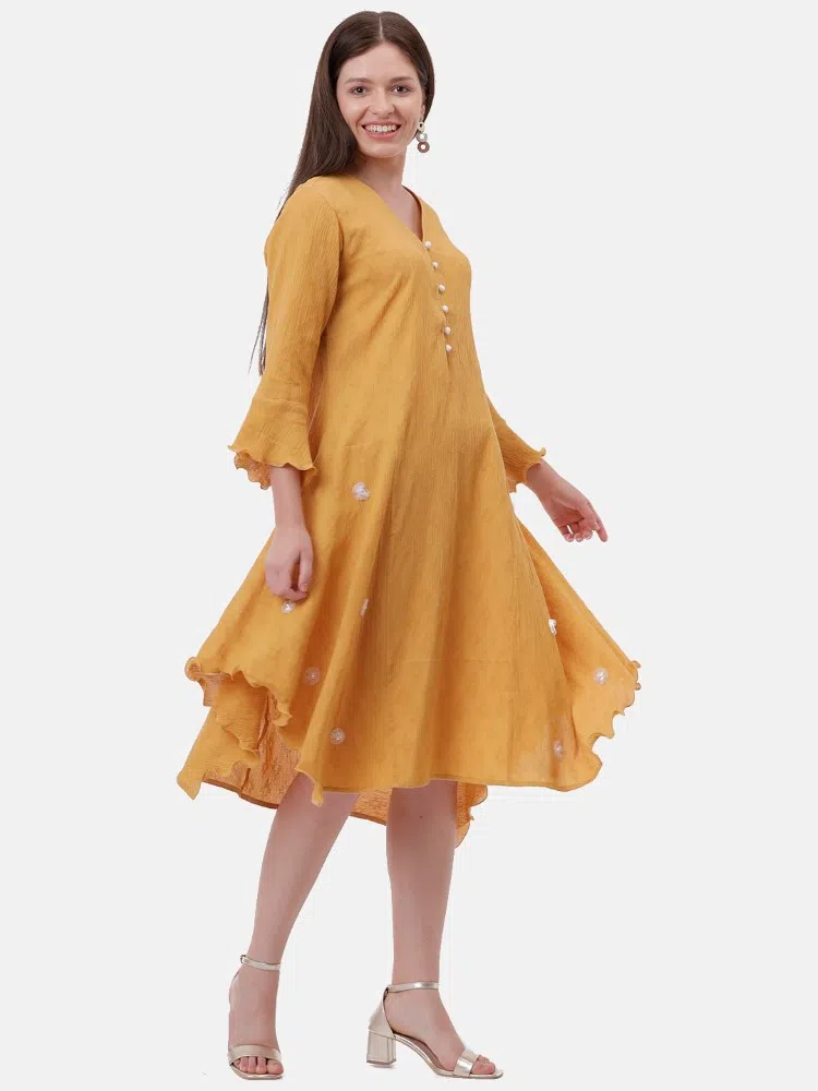 Step into a blend of comfort and chic style with our Sunshine Whirl Dress, crafted from soft, crush cotton in an eye-catching mustard yellow. This dress boasts an inventive asymmetrical spiral hem that adds a playful twist to your movements, while delicate net floral detailing infuses a touch of elegance. Perfect for weekend outings or casual get-togethers, this dress combines functionality with flair, ensuring you stand out in every crowd. Its breathable material and loose fit offer ultimate comfort, making it your go-to choice for all-day wear.