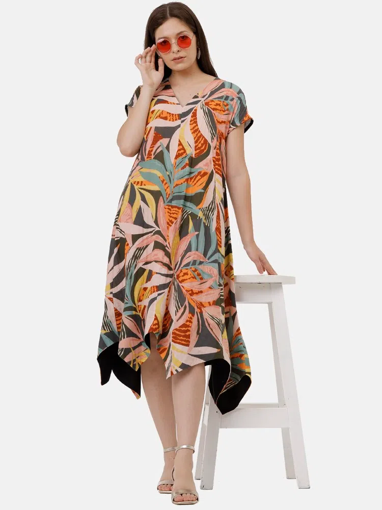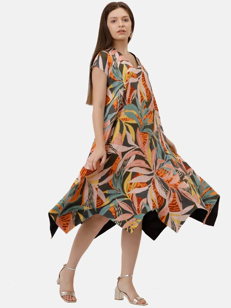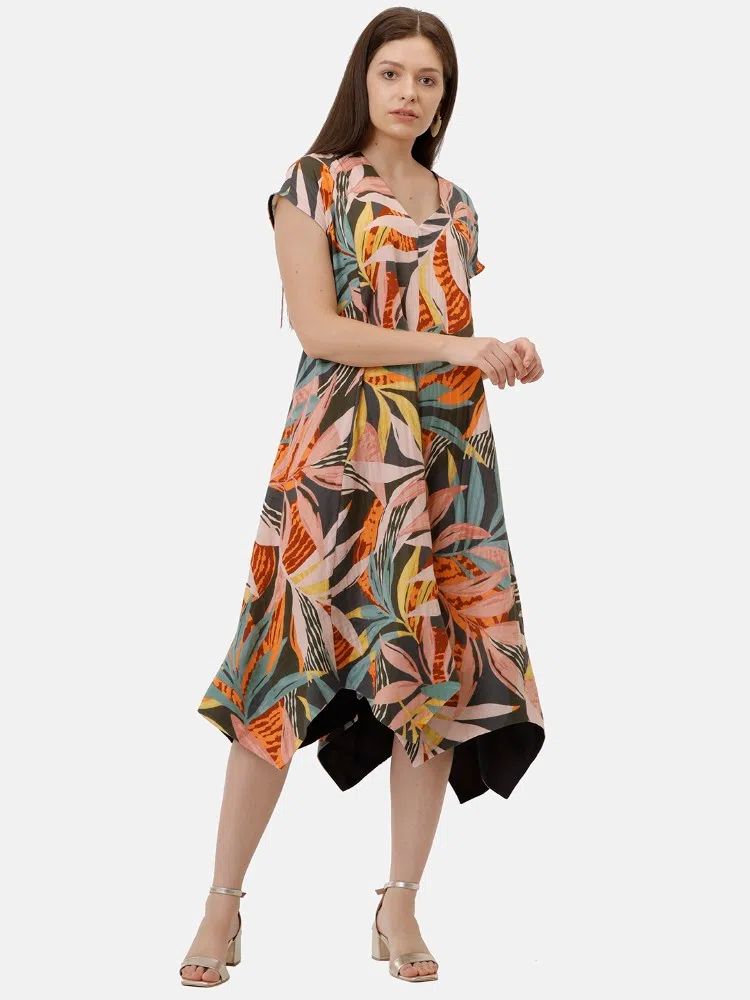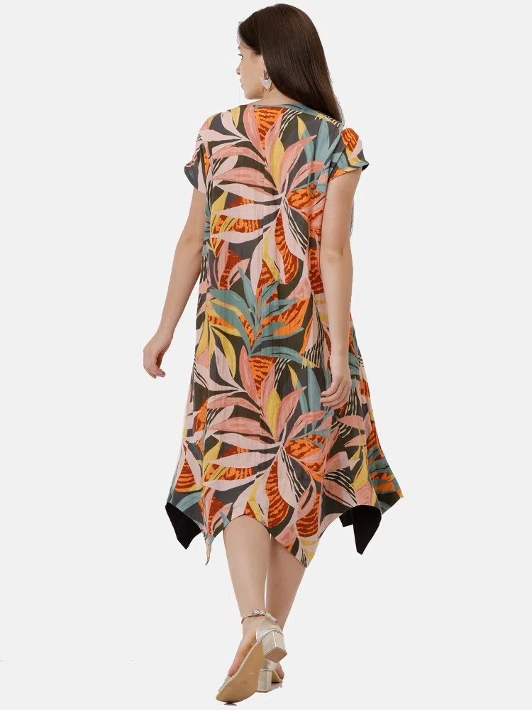 Our Tropical Escape Panel Dress is your gateway to a vibrant and bold fashion statement. Crafted from soft, breathable double muslin, this dress offers both comfort and a luxurious feel. The vivid tropical multi-color print brings to life the lush palette of an exotic escape, making it a standout piece for any occasion. The unique panel cut design and meandering hem add layers of movement and sophistication, ensuring you catch the eye at summer parties or casual beach walks. Elevate your wardrobe with this colorful ensemble and make every moment feel like a holiday.
