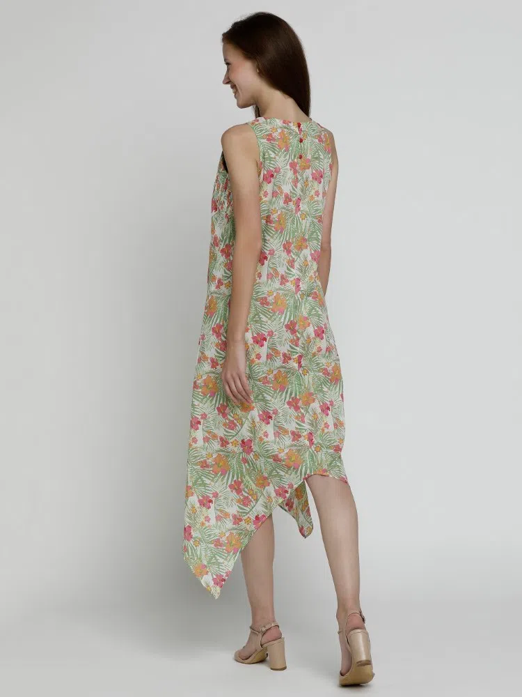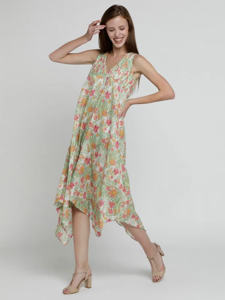 Airy cambric cotton asymmetrical dress with tropical floral design and delicate pintuck details, perfect for brunch or a day out in the city.