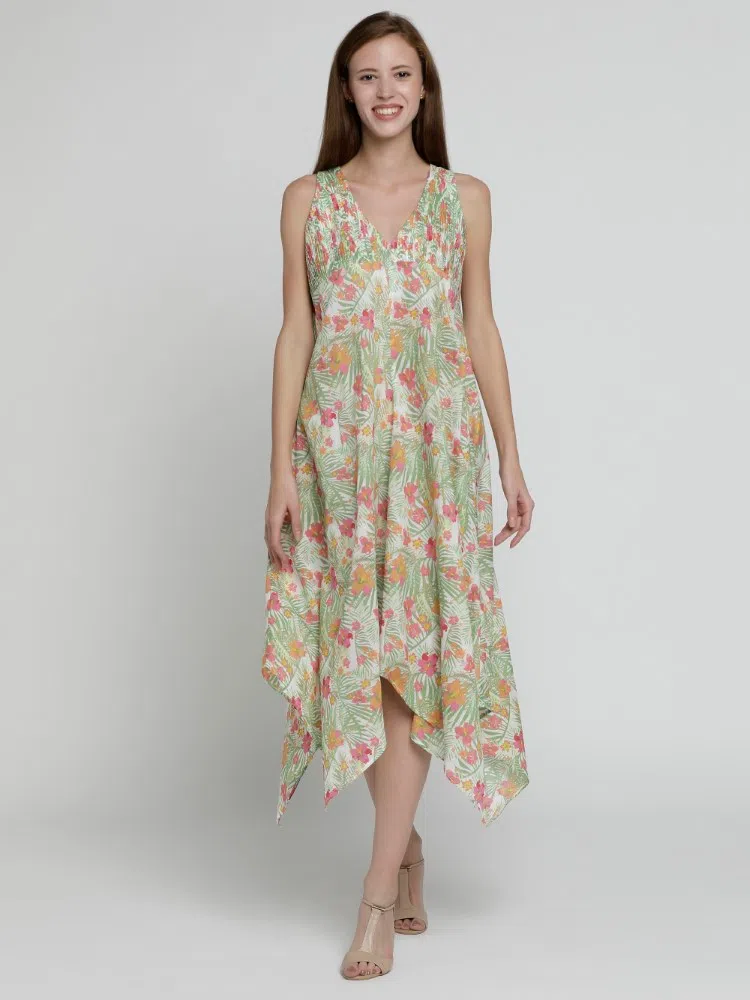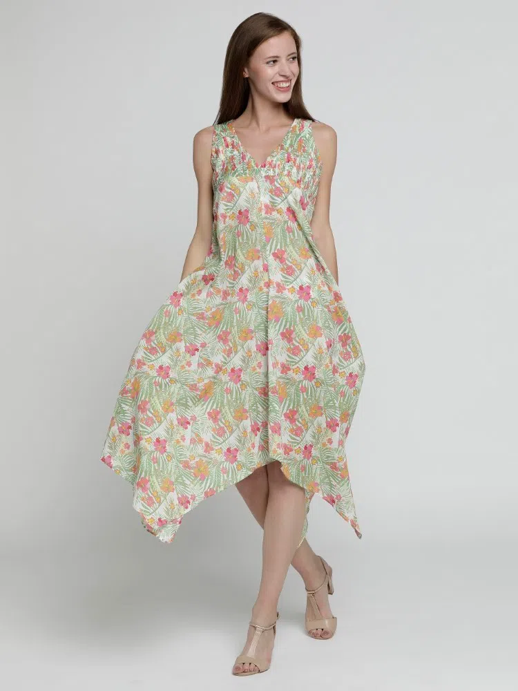 Dive into the lush allure of our Tropical Floral Green Asymmetrical Dress. Crafted from airy cambric cotton, this dress features delicate pintuck details at the yoke and a playful asymmetrical hem that dances around your legs. It’s perfect for those who love a touch of nature-inspired charm in their wardrobe. Whether you’re off to a brunch or a day in the city, this piece promises to keep you cool and stylish.