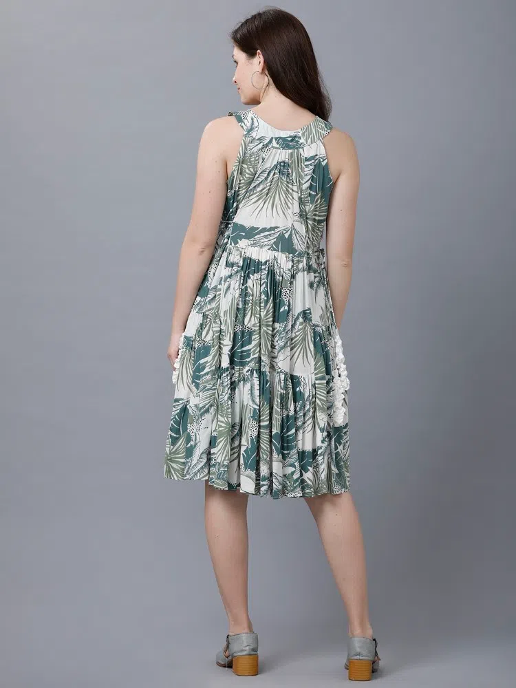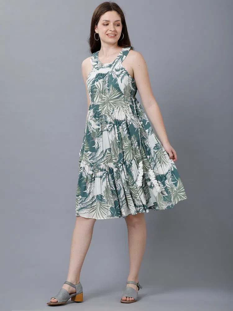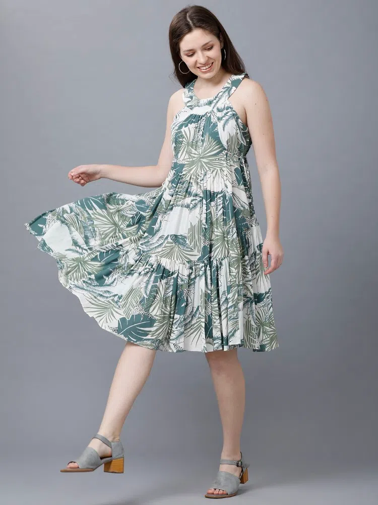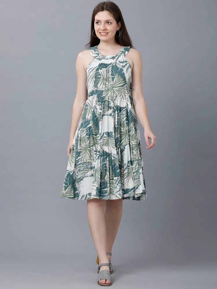 Capture the essence of summer with our ‘Tropical Tides Dress’, designed to bring a splash of the exotic to your wardrobe. This dress is made from lightweight crush cotton, ideal for staying cool on warm days. Its vibrant tropical green shade is printed with lush leaf patterns, perfect for seasonal outings or a resort getaway. The design features unique center tiers that create a flattering silhouette, complemented by adjustable side ties for a custom fit. Flowy and playful, this dress ensures you’ll stand out in comfort and style, whether you’re sipping cocktails by the pool or exploring seaside towns.