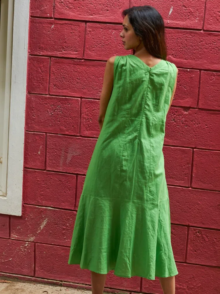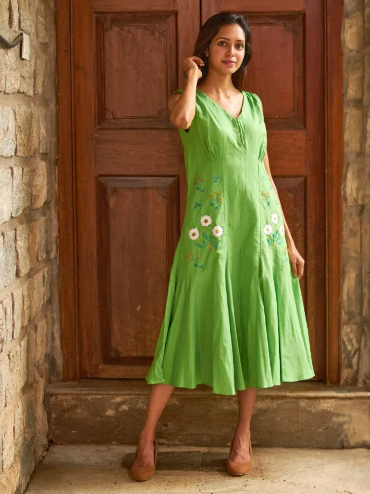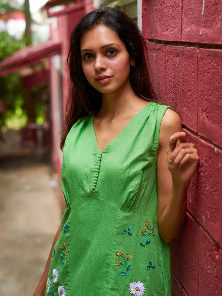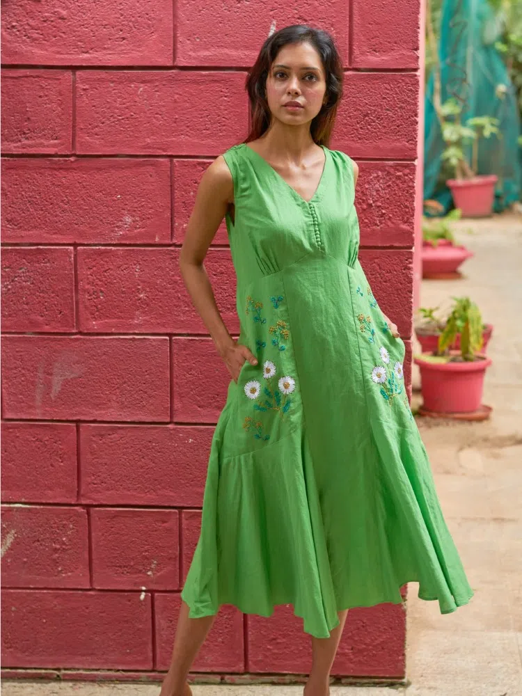Discover the freshness of spring in our Verdant Blossom Embroidered Dress, a piece that celebrates the charm of handcrafted beauty. Constructed from the finest cotton linen blend, this lime green dress is as comfortable as it is captivating. The bias-cut hem adds a whimsical twist to your movements, making it perfect for a variety of occasions, from garden parties to weekend getaways.
