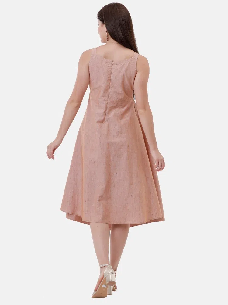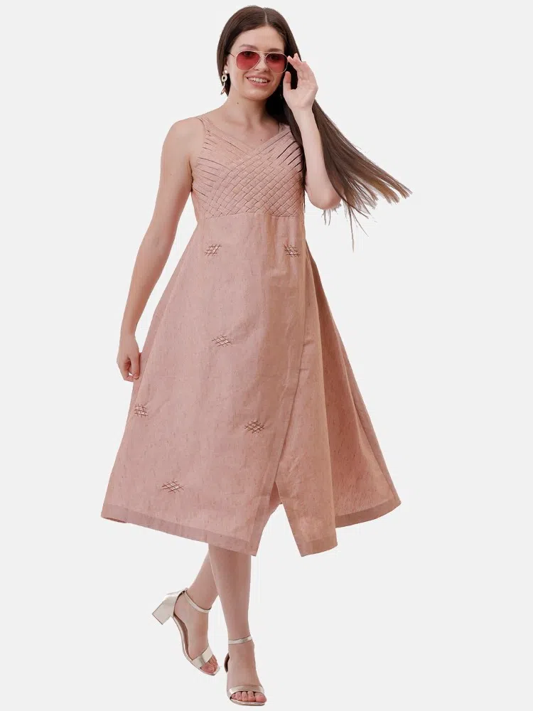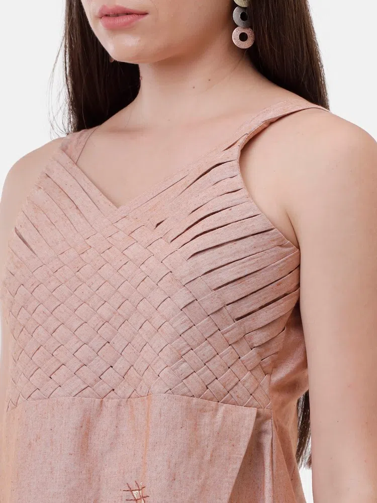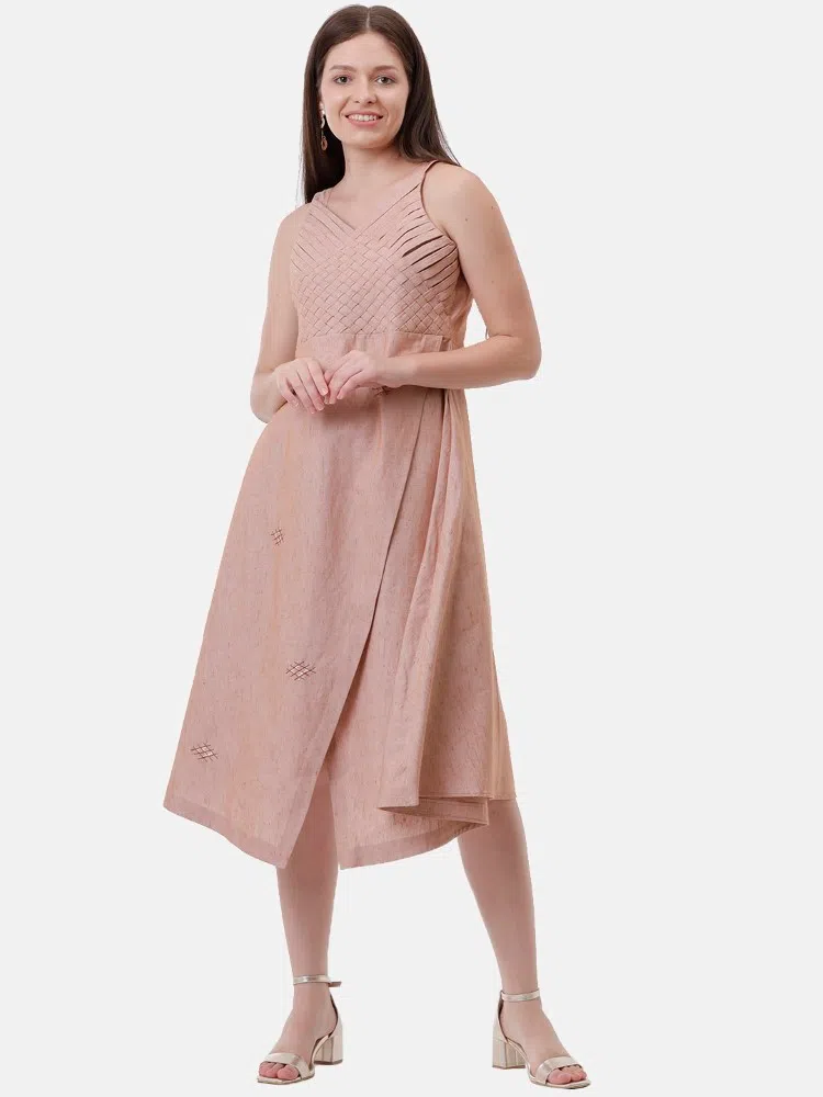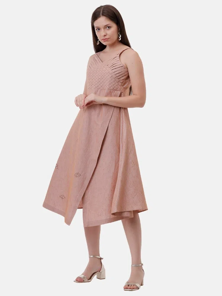 Discover the charm of sustainable fashion with our Woven Essence Dress, a masterpiece woven from the finest Khadi cotton in an earthy light mud brown. This dress features a unique criss-cross bodice that flatters the figure, leading into a soft, flowing silhouette that offers both comfort and style. The yoke, woven with meticulous attention to detail, is adorned with exquisite hand embroidery, showcasing traditional craftsmanship in a modern design. Each stitch adds a touch of elegance and uniqueness, making this dress not just an outfit but a piece of art. Ideal for special occasions or as a statement piece for casual outings, the Woven Essence Dress embodies elegance and environmental consciousness, perfect for the eco-savvy fashionista.